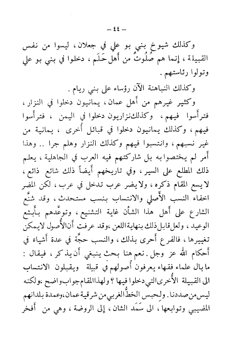 وكثير غيرهم من أهل عمان، يمانيون دخلوا في النزار، وترأسوا فيهم، وكذلك نزاريون دخلوا في اليمن، فترأسوا فيهم، وكذلك يمانيون دخلوا قبائل أخرى، يمانية من غير نسبهم، وأنتسبوا فيهم وكذلك النزار وهلم جرا .. وهذا أمر لم يختصوا به بل شاركتهم قيه العرب في الجاهلية، يعلم ذلك المطلع على السير، وفي تاريخهم أيضًا ذلك شائع ذائع، لايسع المقام ذكره، ولا يضر عرب تدخل في عرب، لكن المضر حفاء النسب الأصلي والآنتساب بنسب مستحدث، وقد شنع الشارع على أهل هذا الشأن غاية التشنيع، وتوعدهم بأبشع وعيد، ولعل قابل ذلك بنهاية اللعن، وقد عرفت أن الأصول لايمكن تغييرها، فالفرع أحرى بذلك، والنسب حجة في عدة أشياء في أحكام الله عز وجل. نعم هنا بحث ينبغي أن يذكر، فيقال: مابال علماء فقهاء يعرفون أصولهم في قبيلة ويقبلون الأنتساب القبيلة الأخرى الني دخلوا فيها؟ ولهذا المقام جواب واضح، ولكنه ليس من صددنا. ولحبس الخط الغربي من شرقية عمان، وعمدة بلدانهم سيبي وتوابعها، إلى سمد الشان، إلى الروضة، وهي من أفخر