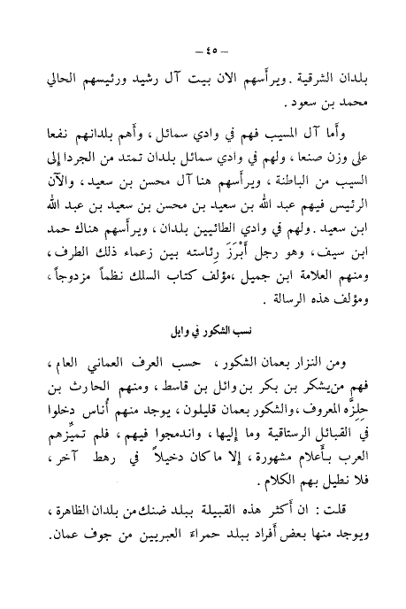 وأما آل المسيب فهم من وادي سمائل، وأهم بلدانهم نفعا على وزن صنعا، ولهم في وادي سمائل بلدان تمتد من الجردا إلى السيب من البطانة، ويرأهم هنا آل محسن بن سعيد، والآن الرئيس فيهم عبد الله بن سعيد بن محسن بن سعيد بن عبد الله بن سعيد. ولهم في وادي الطائيين بلدان، ويرأسهم هناك حمد بن سيف، وهو رجل أبرز رئاسته بين زعماء ذلك الطرف، ومنهم العلامة ابن جميل، مؤلف كتاب السلك نظمًا مزدوجًا، ومؤلف هذه الرسالة.