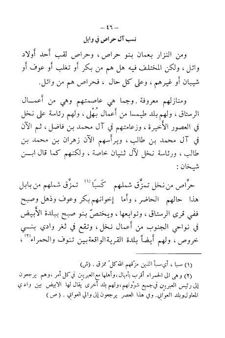 ومنازلهم معروفة. وجما هي عاصمتهم وهي من أعمال الرستاق، ولهم بلد طيمسا من أعمال بهلى، ولهم رئاسة على نخل في العصور الأخيرة، وزعامتهم في آل محمد بن فاضل، ثم الآن في آل محمد بن طالب، ويرأسهم الآن زهران بن محمد بن طالب، ورءاسة نخل لآل ثنيان خاصة، ولكنهم كما قال ابن شيخان: خراص من نخل تمزق شملهم كَسبَا (¬١) تمزق شملهم من بابل هذا حالهم الحاضر، وأما أخوانهم بكر وعوف وهذل وصبح ففي قرى الرستاق، وتوابعها، ويختص بنو صبح ببلدة الأبيض في نواحي الجنوب من أعمال نخل، وتقع في ثغر وادي بني خروص، ولهم أيضًا بلدة القرية الواقعة بين تنوف والحمراء (¬٢)،