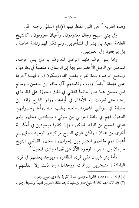 وأما بنو عوف فلهم الوادي المعروف بوادي بني عوف، المنحدر من الجبل الأخضر متوجهًا إلى الرستاق، منصبًا في بطاحها، ومجمع أمرهم، بلدة الفرع بفتخ الفاء وسكون الراء المهملة آخرها عين مهملة أيضًا. وبيت رئاستهم آل سالم بن محسن، وسالم ابن محسن هذا صار حاتمًا الثاني في تلك الحوزة على قلة ما في يده، حتى ضربت به الأمثال في أيامه، وزار الشيخ زائد بن خليفة في ابو ظبي لشهرته. ولعله يطلب منه، وأما أخوانهم الذهول فهم في بلدة العوابي من سوني، ويختص محلهم باسم طوي السيح في البلد المذكور، وان كانوا موجودين في أمكنة أخرى من عمان، ولكن طوي السيح مركزهم الوحيد، وفيهم أعيان لهم مقامهم المعتبر بين أخوانهم، ومنهم القا ضي الشيخ سليمان بن ناصر، الموجود الآن على قضاء وادي المعاول (¬٢) .