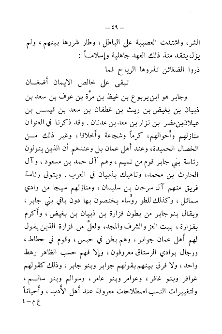 وجابر هو ابن يربوع بن غيظ بن مرَّة بن عوف بن سعد بن ذبيان بن بغيض بن ريث بن غطفان بن سعد بن قيس بن عيلان بن مضر بن نزار بن معد بن عدنان. وقد ذكرنا في العنوان منازلهم وأحوالهم، كرما وشجاعة وأخلاقا، وغير ذلك من الخصال الحميدة، وعند أهل عمان بل وعندهم أن الذين يتولون رئاسة بني جابر قوم من تميم، وهم آل حمد بن مسعود، و آل الحارث بن محمد، وناهيك بذبيان في العرب. ويتولى رئاسة فريق منهم آل سرحان بن سليمان، ومنازلهم سيجا من وادي سمائل، وكذلك للطو روساء يختصون بها دون باقي بني جابر، ويقال بنو جابر من بطون فزارة بن ذبيان بن بغيض، وأكرم بغزارة، بيت العز والشرف والمجد، ولعل من فزارة الذين يقول لهم أهل عمان جوابر، وهم بطن في حبس، وقوم في حطاط، ورجال بوادي الرستاق معروفون، وإلا فهم حسب الظاهر رهط واحد، ولا فرق بينهم بقولهم جوابر وبنو جابر، وذلك كقولهم غوافر وبنو غافر، وعوامر وبنو عامر، وسوالم وبنو سالم، ولتغييرات النسب اصطلاحات معروفة عند أهل الأدب، و أحيانا