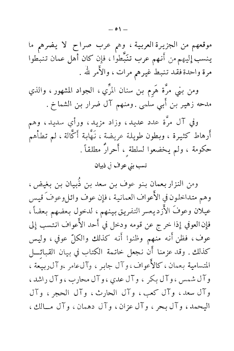 ومن النزار بعمان بنو عوف بن سعد بن ذبيان بن بغيض وهم متداخلون في الأعواف العمانية، فأن عوف وائل وعوف قيس عيلان وعوف الأزد يعسر التفريق بينهم، لدخول بعضهم بعضًا فأن العوفي إذا خرج عن قومه ودخل في أحد الأعواف انتسب إلى عوف، فظن أنه منهم وظنوا أنه كذلك والكل عوفي، وليس كذلك. وقد عزمنا أننجعل خاتمة الكتاب في بيان القبائل المتسامية بعمان، كالأعواف، وآل جابر، وآل عامر، وآل ربيعة، وآل شمس، وآل بكر، وآل عدي، وآل محارب، وآل راشد، وآل سعد، وآل كعب، وآل الحار، وآل الحجر، وآل اليحمد، وآل بحر، وآل عزان، وآل دهمان، وآل مالك،