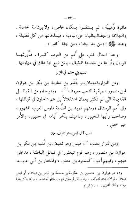 ومن النزارية بعمان بنو جشم بن معاوية بن بكر بنهوازن ابن منصور، وبقية النسب معروف (¬١)، وبنو جشم من القبائل القديمة التي لم تكثر بعمان أستقلالًا بل هم داخلون في قبائلها، وفي أمم الرستاق؛ ومنهم دريد بن الصمة فارس العرب المشهور، وصاحب رأيها المخبور، وناهيك بآخر أيامه في حنين، والأمر غير خفي.