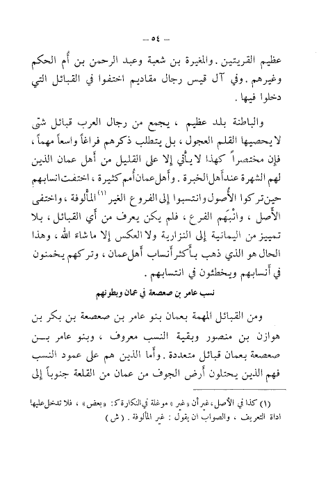 والباطنة بلد عظيم، يجمع من رجال العرب فبائل شتى لايحصيها القلم العجول، بل يتطلب ذكرهم فراغًا واسعًا مهمًا، فأن مختصرًا كهذا لايأتي إلا على القليل من أهل عمان الذين لهم الشهرة عند أهل الخبرة. وأهل عمان أمم كثيرة، اختفت أنسابهم حين تركوا الآصول وانتسبوا إلى الفروع الغير (¬١) المألوفة، واختفى الأصل، وانبهم الفرع، فلم يكن يعرف من أي القبائل، بلا تمييز من اليمانية إلى النزارية ولا العكس إلا ما شاء الله، وهذا الحال هو الذي ذهب بأكثر أنساب أهل عمان، وتركهم يخمنون في أنسابهم ويخطئون في أنتسابهم.