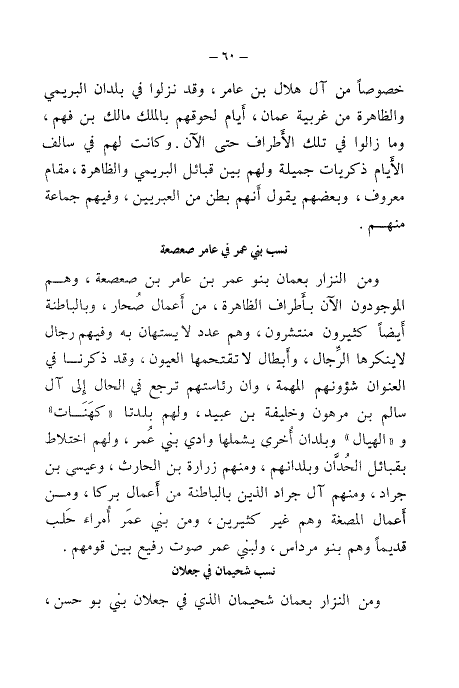 ومن النزار بعمان بنو عمر بن عامر بن صعصعة، وهم الموجودون الآن بأطراف الظاهرة، من أعمال صحار، وبالباطنة أيضًا كثيرون منتشرون، وهم عدد لا يستهان به وفيهم رجال لاينكرها الرجال، وأبطال لاتقتحمها العيون، وقد ذكرنا في العنوان شؤونهم المهمة، وأن رئاستهم ترجع في الحال إلى آل سالم بن مرهون وخليفة بن عبي، ولهم بلدتا (كهَنَات) و (الهيال) وبلدان أخرى يشملها وادي بني عُمر، ولهم اختلاط بقبائل الحُدَّان وبلدانهم، ومنهم زرارة بن الحارث، وعيسى بن جرا، ومنهم آل جراد الذين بالباطنة من اعمال بركا ومن اعمال المصغة وهم غير كثيرين، ومن بني عمَر أُمراءُ حلب قديمًا وهم بنو مرداس، ولبني عمر صوت رفيع بين قومهم.