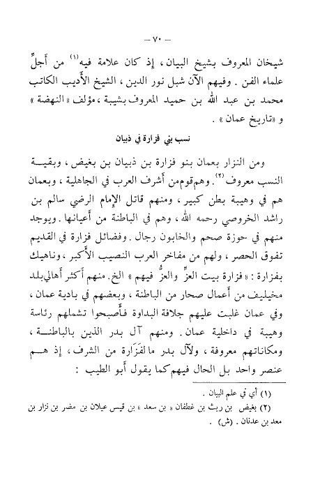 شيخان المعروف بشيخ البيان، إذ كان علامة فيه (¬١) من أجل علماء الفن. وفيهم الآن شبل نور الدين، الشيخ الأديب الكاتب محمد بن عبد الله بن حميد المعروف بشيبة، مؤلف (النهضة) و (تاريخ عمان) ".