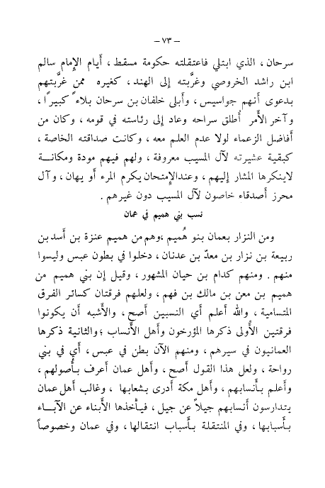 ومن النزار بعمان بنو هميم، وهم نت هميم عتزة بنأسد بن ربيعة بن نزار بن معد بن عدنان، دخلوا في بطون عبس وليسوا منهم وليسوا منهم. ومنهم كدام بن حيان المشهور، وقيل أن بني هميم من هميم بن معن بن مالك بن فهم، ولعلهم فرقتان كسائر الفرق المتسامية، والله أعلم أي النسبين أصح، والأشبه أن يكونوا فرقتين الأولى ذكرها المؤرخون وأهل الأنساب؛ والثانية ذكرها العمانيون في سيرهم، ومنهم الآن بطن في حبس، أي في بني رواحة، ولعل هذا القول أصح، وأهل عمان أعرف بأصولهم، وأعلم بأنسابهم، وأهل مكة أدرى بشعابها، وغالب أهل عمان يتدارسون أنسابهم جيلًاعن جيل، قيأخذها الأبناء عن الآباء بأسبابها، وفي المنتقلة بأسباب انتقالها، وفي عمان وخصوصًا
