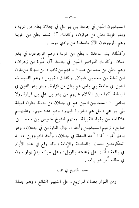 وكذلك بنو ساعدة، بطن من غزية، وهم الموجودون في بدو عمان. وكذلك النواصر الذين في جامعة آل عبرة بن زهران، وهم بطن من سعد بن ذبيان، فهم من ناصرة بن بجالة بن مازن بن ثعلبة بن سعد بن ذبيان. وكذلك القبوس، وهم القبيسات الذين في جامعة بني ياس هم بطن من فزارة. وبنو بدر الذين في الباطنة كما سبق الكلام عليهم من بدر بن علي بن فزارة. ولا يخفى أن السنديين الذين هم في جعلان من جملة بطون قبيلة بني بو علي، بل هم الشرارة فيهم، وهم عدد مهم، وعليهم علاقات من بقية القبيلة. ومنهم الشيخ خميس بن سعد بن صالح، زعيم السنديين وأحد الرجال البارزين في جعلان، وهو بحق أقول كان أحد الدهاة في عجلان، وأحد المتوجهين عند الحكومتين بعمان: السلطنة والإمامة، وقد وقع في هذه الأيام في باقعة، أتت على زعامته بالويل، وعلى حياته بالأنهيار، ولله في خلقه أمر هو بالغه.