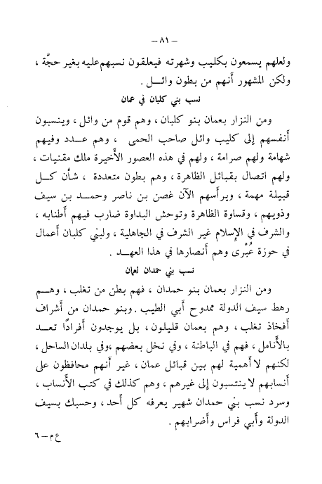 ومن النزار بعمان بنو كلبان، وهم قوم من وائل، وينسبون أنفسهم إلى كليب وائل صاحب الحمى، وهم عدد وفيهم شهامة ولهم صوامة، ولهم في هذه العصور الأخيرة ملك مقنيات، ولهم أتصال بقبائل الظاهرة، وهم بطون متعددة، شأن كل قبيلة مهمة، ويرأسهم الآن غصن بن ناصر وحمد بن سيف وذويهم، وقساوة الظاهرة وتوحش البداوة ضارب فيهم أطنابه، والشرف في الإسلام غير الشرف في الجاهلية، ولبني كلبان أعمال في حوزة عبرى وهم أنصارها في هذا العهد.