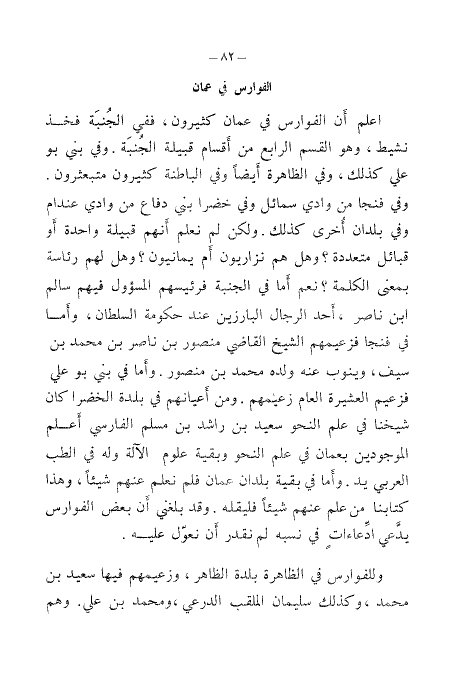 اعلم أن الفوارس في عمان كثيرون، ففي الجنبة فخذ نشيط، وهو القسم الرابع من أقسام قبيلة الجنبة. وفي بني بو علي كذلك، وفي الظاهرة أيضًا وفي الباطنة كثيرون متبعثرون. وفي فنجا من وادي سمائل وفي خضرا بني دفاع من وادي عندام وفي بلدان أخرى كذلك. ولكن لم نعلم أنهم قبيلة واحدة أو قبائل متعددة؟ وهل هم نزاريون أم يمانيون؟ وهل لهم رئاسة بمعنى الكلمة؟ نعم أما في الجنبة فرئيسهم المسؤول فيهم سالم بن ناصر، أحد الرجال البارزين عند حكومة السلطان، وأما في فنجا فزعيمهم الشيخ القاضي منصور بن ناصر بن محمد بن سيف، وينوب عنه ولده محمد بن منصور. وأما في بني بو علي فزعيم العشيرة العام زعيمهم. ومن أعيانهم من بلدة الخضرا كان شيخنا في علم النحو سعيد بن واشد بن مسلم الفارسي أعلم الموجودين بعمان في علم النحو وبقية علوم الآلة وله في الطب العربي يد. وأما في بقية بلدان عمان فلم نعلم عنهم شيئًا، وهذا كتابنا من علم عنهم شيئًافليقله. وقد بلغني أن بعض الفوارس يدعي ادعاءات في نسبه لم نقدر أن نعول عليه.
