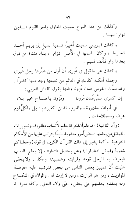 (وأما الثانية): فاعلم أن المعرفة بعلم الأنساب مطلوبة، وتمييزاتالقبائل من بعضها لبعض أمور مندوبة، لما يترتب عليها من الأحكام الشرعية، كما يشير إلى ذلك القرآن الكريم في قوله: (وجعلناكم شعوبًا وقبائل لتعارفوا)، وهل يحصل التعارف إلا بعلم النسب فيعرف به الرجل قومه وقرابته وعصبيته وهكذا.