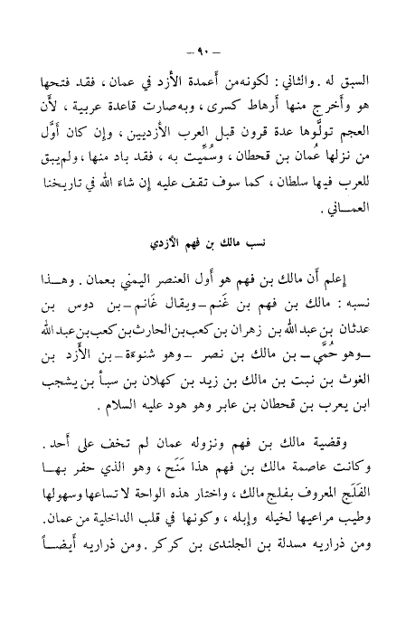 السبق له. والثاني: لكونه من أعمدة الأزد في عمان، فقد فتحها هو وأخرج منها أرهاط كسرى، وبه صارت قاعدة عربية، لأن العجم تولوها عدة قرون قبل العرب الأزديين، وأن كان أول من نزلها عمان بن قحطان، وسميت به، وقد باد منها، ولم يبقى للعرب فيها سلطان، كما سوف تقف عليه إن شاء الله في تاريخنا العماني.