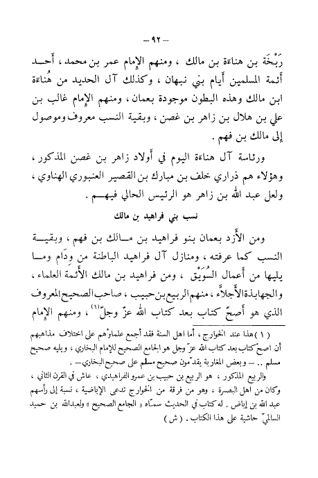 ومن الأزد بعمان بنو فراهيد بن مالك بن فهم، وبقية النسب كما عرفته، ومنازل آل فراهيد الباطنة من ودام وما يليها من أعمال السويق، ومن فراهيد بن مالك الأئمة العلماء، والجهابذة الأجلاء، منهم الربيع بن حبيب، صاحب الصحيح المعروف الذي هو أصح كتاب بعد كتاب الله عز وجل (¬١)، ومنهم الإمام