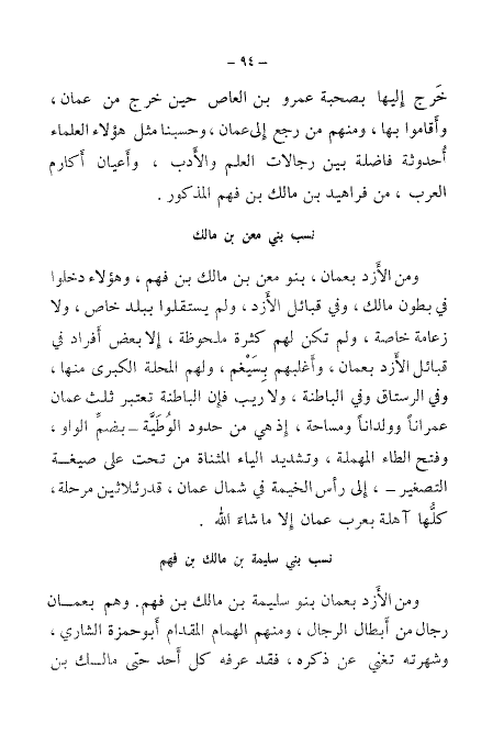ومن الأزد بعمان، بنو معن بن مالك بن فهم، وهؤلاء دخلوا في بطون مالك، وفي قبائل الأزد، ولم يستقلوا ببلد خاص، ولا زعامة خاصة، ولم تكن لهم كثرة ملحوظة، إلا بعض أفراد في قبائل الأزد بعمان، وأغلبهم بسيغهم، ولهم المحلة الكبرى منها، وفي الرستاق وفي الباطنة، ولا ريب فأن الباطنة، تعتبر ثلث عمان عمرانًا وولدانًا ومساحة، إذ هي من حدود الوطية بضم الواو، وفتح الطاء المهملة، وتشديد الياء المثناة من تحت على صيغة التصغير، إلى رأس الخيمة في شمال عمان، قدر ثلاثين مرحلة كلها آهلة بعرب عمان إلا ما شاء الله.