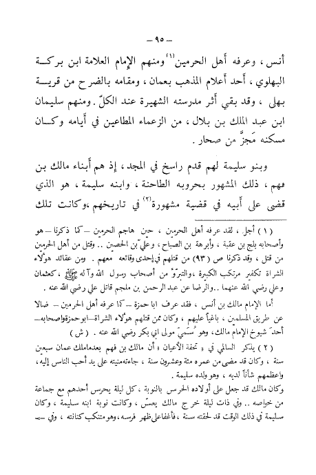 أنس، وعرفه أهل الحرمين (¬١) ومنهم الإمام العلامة ابن بركة البهلوي، أحد أعلام المذهب بعمان، ومقامه بالضرح من قرية بهلى، وقد بقي أثر مدرسته الشهيرة عند الكل، ومنهم سليمان بن عبد الملك بن بلال، من الزعماء المطاعين في أيامه وكان مسكنه مجز من صحار.