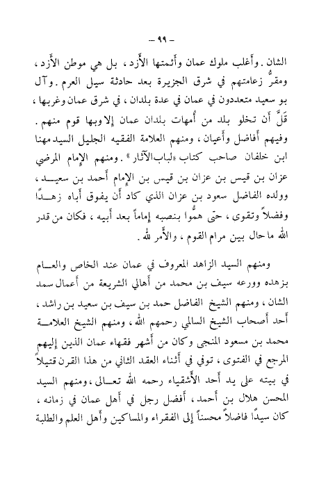 الشان. وأغلب ملوك عمان وأئمتها الأزد، بل هي موطن الأزد، ومقر زعامتهم في شرق الجزيرة بعد حادثة سيل العرم. وآل بو سعيد متعددون في عمان في عدة بلدان، في شرق عمان وغربها، قل أن تخلو بلد من أمهات بلدان عمان إلا وبها قوم منهم. وفيهم أفاضل وأعيان، ومنهم العلامة الفقيه الجليل السيد مهنا بن خلفان صاحب كتاب " لباب الآثار ". ومنهم الإمام المرضي عزان بن قيس بن عزان بن قيس بن الإمام أحمد بن سعيد، وولده الفاضل سعود بن عزان الذي كاد أن يفوق أباه زهدًا وفضلًا وتقوى، حتى هموا بنصبه إمامًا بعد أبيه، فكان من قدر الله ما حال بين مرام القوم، والأمر لله.