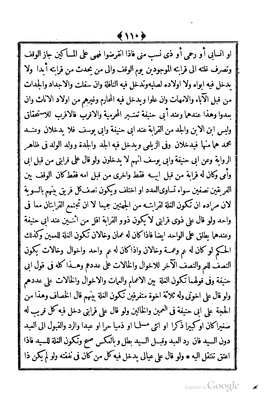 أو أنسابي أو رحمي أو ذي نسب مني فإذا انقرضوا فهي على المساكين جاز الوقف وتصرف غلته إلى قرابته الموجودين يوم الوقف وإلى من يحدث من قرابته أبدا ولا يدخل فيه أبواه ولا أولاده لصلبه وتدخل فيه النافلة وإن سفلت والأجداد والجدات من قبل الآباء والأمهات وإن علوا ويدخل فيه المحارم وغيرهم من أولاد الإناث وإن بعدوا وهذا عندهما وعند أبي حنيفة تعتبر المحرمية والأقرب فالأقرب للاستحقاق وليس ابن الابن والجد من القرابة عند أبي حنيفة وأبي يوسف فلا يدخلان وعند محمد هما منها فيدخلان وفي الزيلمي ويدخل فيه الجد والجدة وولد الولد في ظاهر الرواية وعن أبي حنيفة وأبي يوسف انهم لا يدخلون ولو قال على قرابتي من قبل أبي وأمي وكان له قرابة من قبل أبيه فقط وأخرى من قبل أمه فقط كان الوقف بين الفريقين نصفين سواء تساوى العدد أو اختلف ويكون نصف كل فريق بينهم بالسوية لأن مراده أن تكون الغلة لقرابته من الجهتين جميعا لا أن تجتمع القرابتان معا في واحد ولو قال على ذوي قرابتي لا يكون ذوو القرابة أقل من اثنين عند أبي حنيفة وعندهما يطلق إلى الواحد أيضا فإذا كان له عمان وخالان تكون الغلة للعمين وكذلك الحكم لو كان له عم وعمة وخالان وإذا كان له عم واحد وأخوال وخالات يكون النصف للعم والنصف الآخر للأخوال والخالات على عددهم وهذا كله في قول أبي حنيفة وفي قولهما تكون الغلة بين الأعمام والعمات والأخوال والخالات على عددهم ولو قال على إخوتي وله ثلاثة إخوة متفرقين تكون الغلة بينهم قال الخصاف وهذا من الحجة على أبي حنيفة في العمين والخالين ولو قال على قرابتي دخل فيه كل قريب له صغيرا كان أو كبيرا ذكرا أو أنثى مسلما أو ذميا حرا أو عبدا والرد والقبول إلى العبد دون السيد فإن رد العبد وقبل السيد بطل وبالعكس صح وتكون الغلة للسيد فإذا أعتق انتقل إليه، ولو قال على عيالي يدخل فيه كل من كان في نفقته ولو لم يكن ذا