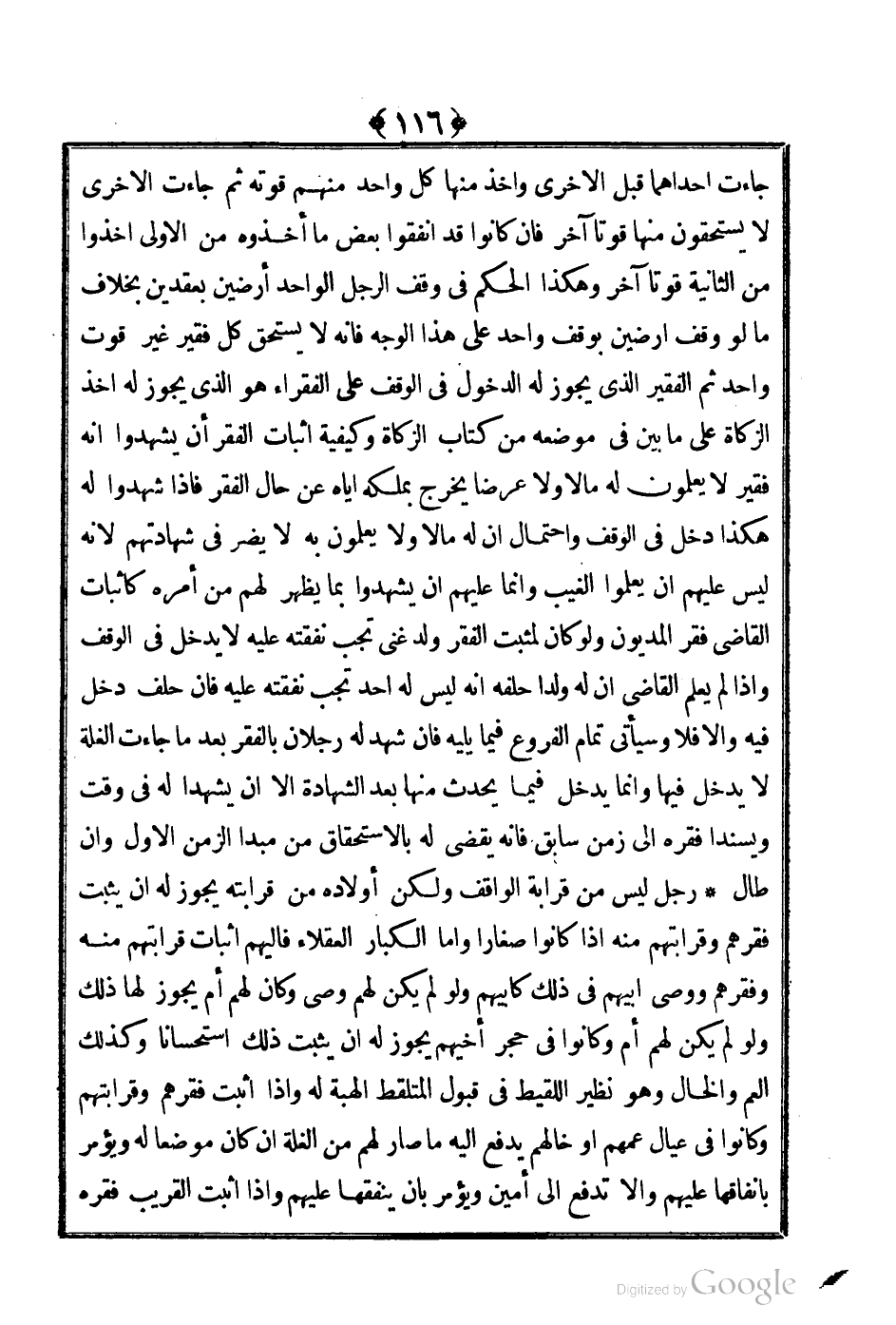 جاءت إحداهما قبل الأخرى وأخذ منها كل واحد منهم قوته ثم جاءت الأخرى لا يستحقون منها قوتا آخر فإن كانوا قد أنفقوا بعض ما أخذوه من الأولى أخذوا من الثانية قوتا آخر وهكذا الحكم في وقف الرجل الواحد ارضين بعقدين بخلاف ما لو وقف أرضين بوقف واحد على هذا الوجه فإنه لا يستحق كل فقير غير قوت واحد ثم الفقير الذي يجوز له الدخول في الوقف على الفقراء هو الذي يجوز له أخذ الزكاة على ما بين في موضعه من كتاب الزكاة وكيفية إثبات الفقر أن يشهدوا أنه فقير لا يعلمون له مالا ولا عرضا يخرج بملكه إياه عن حال الفقر فإذا شهدوا له هكذا دخل في الوقف واحتمال أن له مالا ولا يعلمون به لا يضر في شهادتهم لأنه ليس عليهم أن يعلموا الغيب وإنما عليهم أن يشهدوا بما يظهر لهم من أمره كإثبات القاضي فقر المديون ولو كان لمثبت الفقر ولد غني تجب نفقته عليه لا يدخل في الوقف وإذا لم يعلم القاضي أن له ولدا حلفه أنه ليس له أحد تجب نفقته عليه فإن حلف دخل فيه وإلا فلا وسيأتي تمام الفروع فيما يليه فإن شهد له رجلان بالفقر بعد ما جاءت الغلة لا يدخل فيها وإنما يدخل فيما يحدث منها بعد الشهادة إلا أن يشهدا له في وقت ويسندا فقره إلى زمن سابق فإنه يقضي له بالاستحقاق من مبدأ الزمن الأول وإن طال، رجل ليس من قرابة الواقف ولكن أولاده من قرابته يجوز له أن يثبت فقرهم وقرابتهم منه إذا كانوا صغارا وأما الكبار العقلاء فإليهم إثبات قرابتهم منه وفقرهم ووصي أبيهم في ذلك كأبيهم ولو لم يكن لهم وصي وكان لهم أم يجوز لها ذلك ولو لم يكن لهم أم وكانوا في حجر أخيهم يجوز له أن يثبت ذلك استحسانا وكذلك العم والخال وهو نظير اللقيط في قبول المتلقط الهبة له وإذا أثبت فقرثم وقرابتهم وكانوا في عيال عمهم أو خالهم يدفع إليه ما صار لهم من الغلة إن كان موضعا له ويؤمر بإنفاقها عليهم وإلا تدفع إلى أمين ويؤمر بأن ينفقها عليهم وإذا أثبت القريب فقره
