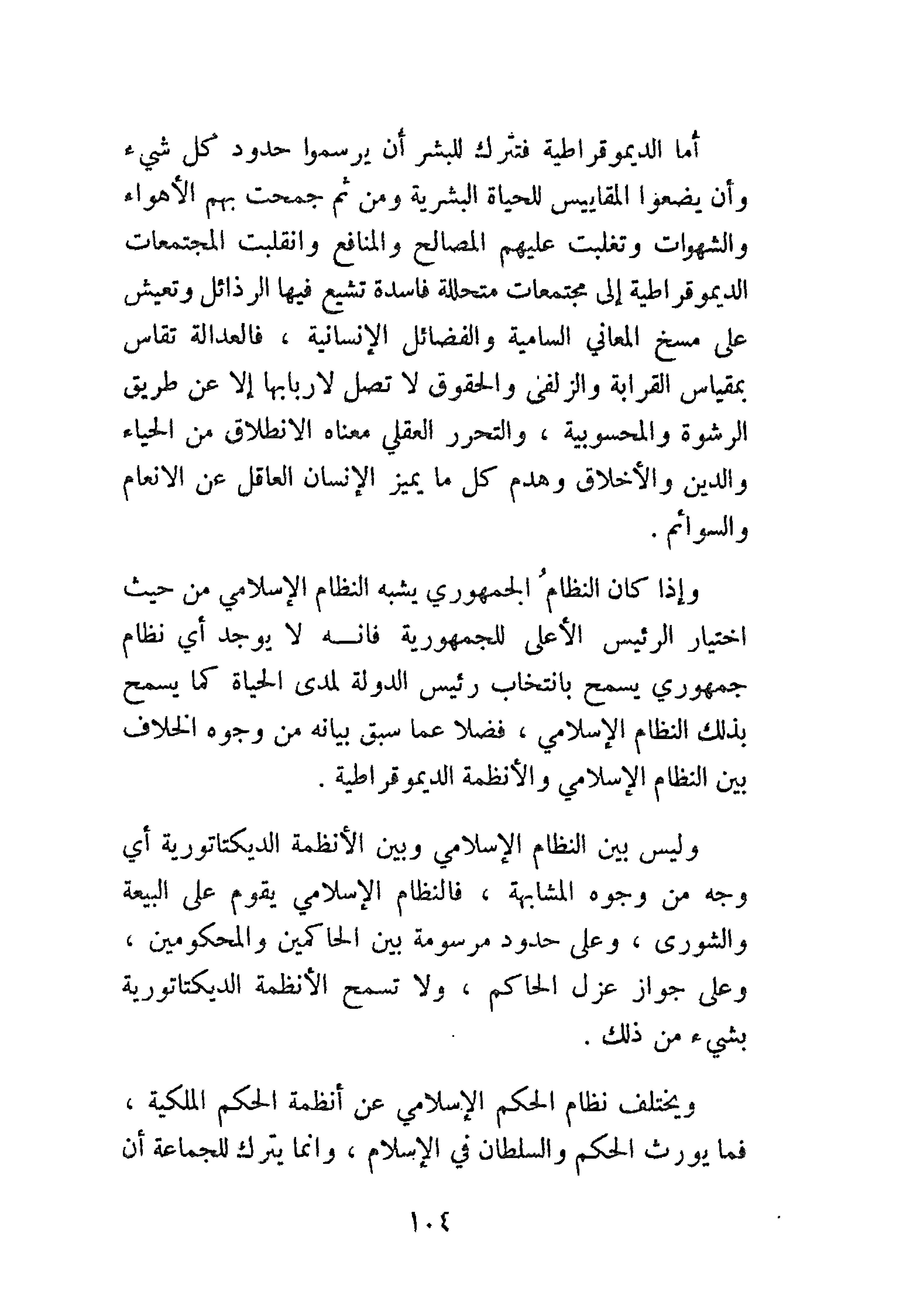 أما الديموقراطية فتترك للبشر أن يرسموا حدود كل شيء وأن يضعوا المقاييس للحياة البشرية ومن ثم جمحت بهم الأهواء والشهوات وتغلبت عليهم المصالح والمنافع وانقلبت المجتمعات الديموقراطية إلى مجتمعات متحللة فاسدة تشيع فيها الرذائل وتعيش على مسخ المعاني السامية والفضائل الإنسانية، فالعدالة لا تقاس بمقياس القرابة والزلفى والحقوق لا تصل لأربابها إلا عن طريق الرشوة والمحسوبية، والتحرر العقلي معناه الانطلاق من الحياة والدين والأخلاق وهدم كل ما يميز الإنسان العاقل عن الأنعام والسوائم.