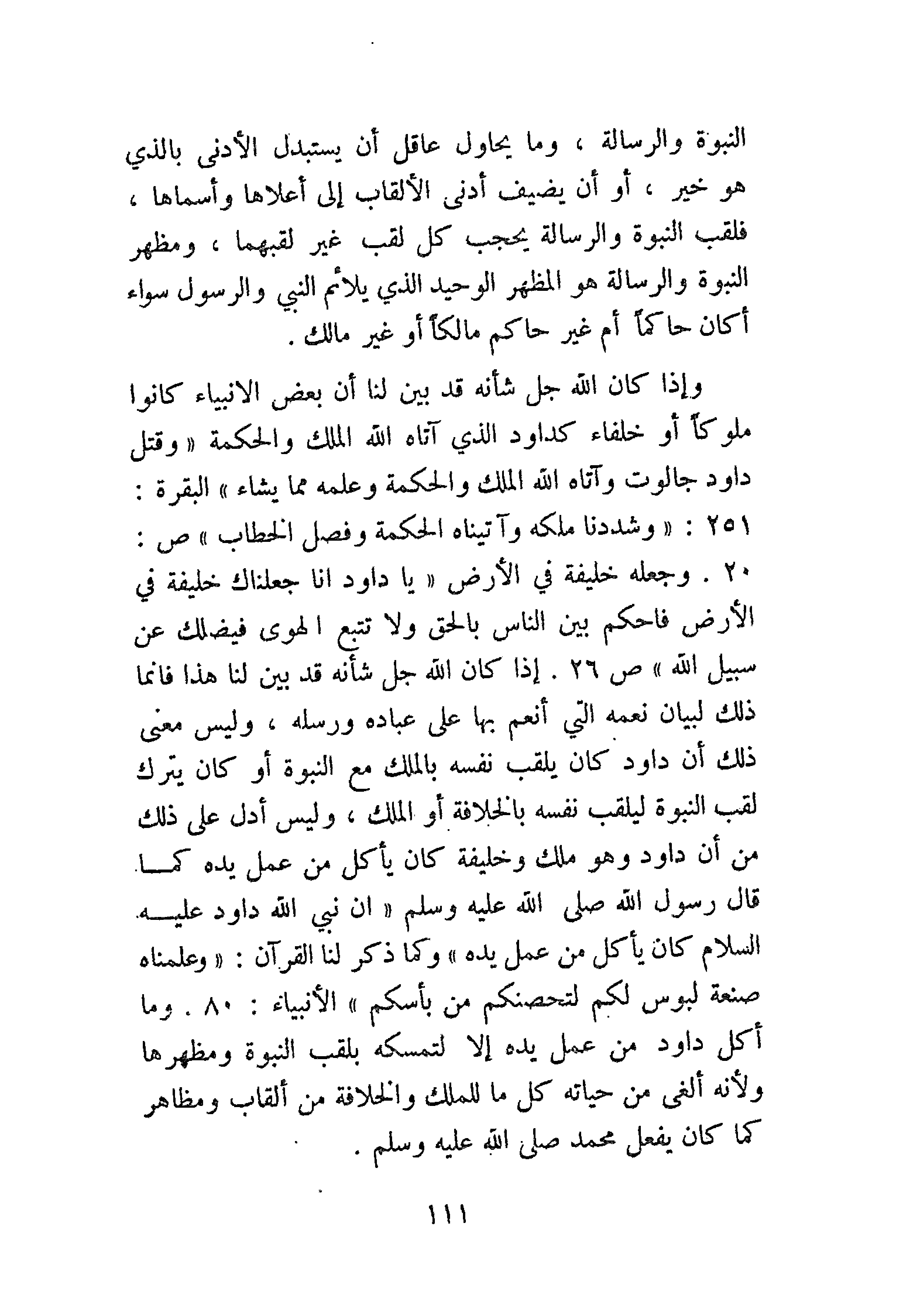 وإذا كان الله - جَلَّ شَأْنُهُ - قد بين لنا أن بعض الأنبياء كانوا ملوكًا أو خلفاء كداوود الذي آتاه الله الملك والحكمة {وَقَتَلَ دَاوُودُ جَالُوتَ وَآتَاهُ اللَّهُ الْمُلْكَ وَالْحِكْمَةَ وَعَلَّمَهُ مِمَّا يَشَاءُ} [البقرة: 251]. {وَشَدَدْنَا مُلْكَهُ وَآتَيْنَاهُ الْحِكْمَةَ وَفَصْلَ الْخِطَابِ} [ص: 20]. وجعله خليفة في الأرض {يَا دَاوُودُ إِنَّا جَعَلْنَاكَ خَلِيفَةً فِي الأَرْضِ فَاحْكُمْ بَيْنَ النَّاسِ بِالْحَقِّ وَلاَ تَتَّبِعِ الْهَوَى فَيُضِلَّكَ عَنْ سَبِيلِ اللَّهِ} [ص: 26]. إذا كان الله - جَلَّ شَأْنُهُ - قد بَيَّنَ لنا هذا فإنما ذلك لبيان نعمه التي أنعم بها على عباده ورسله وليس معنى ذلك أن داود كان يلقب نفسه بالملك مع النبوة أو كان يترك لقب النبوة ليلقب نفسه بالخلافة أو الملك، وليس أدل على ذلك من أن داود وهو ملك وخليفة كان يأكل من عمل يده كما قال رسول الله - صَلََّى اللهُ عَلَيْهِ وَسَلَّمَ - «وَإِنَّ نَبِيَّ اللَّهِ دَاوُدَ عَلَيْهِ السَّلاَمُ، كَانَ يَأْكُلُ مِنْ عَمَلِ يَدِهِ»، وكما ذكر لنا القرآن الكريم: {وَعَلَّمْنَاهُ صَنْعَةَ لَبُوسٍ لَكُمْ لِتُحْصِنَكُمْ مِنْ بَأْسِكُمْ} [الأنبياء: 80]. وما أكل داود من عمل يده إلا لتمسكه بلقب النبوة ومظهرها ولأنه ألغى من حياته كل ما للملك والخلافة من ألقاب ومظاهر كما كان يفعل مُحَمَّدٌ - صَلََّى اللهُ عَلَيْهِ وَسَلَّمَ -.