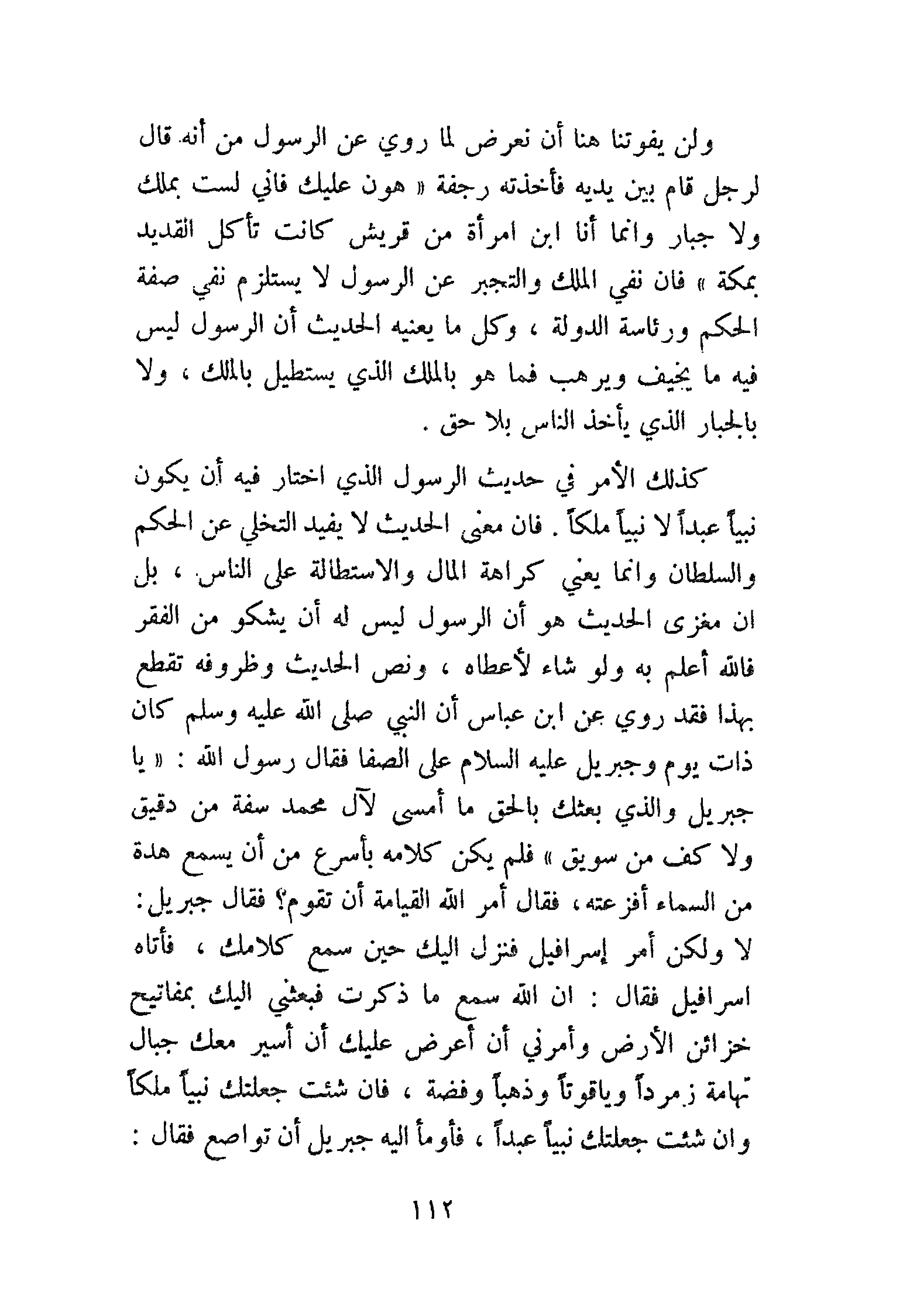 كذلك الأمر في حديث الرسول الذي اختاره فيه أن يكون نبيًا عبدًا لا نبيًا ملكًا. فإن معنى الحديث لا يفيد التخلي عن الحكم والسلطان وإنما يعني كراهة المال والاستطالة على الناس، بل إن مغزى الحديث هو أن الرسول ليس له أن يشكو الفقر فالله أعلم به ولو شاء لأعطاه، ونص الحديث وظروفه تقطع بهذا فقد روي عن ابن عباس أن النبي - صَلََّى اللهُ عَلَيْهِ وَسَلَّمَ - كان ذات يوم وجبريل - عَلَيْهِ السَّلاَمُ - على الصفا فقال رسول الله: «يَا جِبْرِيلُ، وَالذِي بَعَثَكَ بِالحَقِّ مَا أَمْسَى لآلِ مُحَمَّدٍ سَفَّةٌ مِنْ دَقِيقٍ، وَلاَ كَفٌّ مِنْ سَوِيقٍ»، فَلَمْ يَكُنْ كَلاَمُهُ بِأَسْرَعَ مِنْ أَنْ [سَمِعَ] هَدَّةً مِنَ السَّمَاءِ أَفْزَعَتْهُ، فَقَالَ رَسُولُ اللَّهِ صَلَّى اللهُ عَلَيْهِ وَسَلَّمَ: «أَمَرَ اللَّهُ القِيَامَةَ أَنْ تَقُومَ؟» فَقَالَ جِبْرِيلُ: لاَ، وَلَكِنْ أَمَرَ اللَّهُ إِسْرَافِيلَ، فَنَزَلَ إِلَيْكَ حِينَ سَمِعَ كَلاَمَكَ، فَأَتَاهُ إِسْرَافِيلُ، فَقَالَ: إِنَّ اللَّهَ سَمِعَ مَا ذَكَرَتْ، فَبَعَثَنِي إِلَيْكَ بِمَفَاتِيحِ خَزَائِنِ الأَرْضِ، وَأَمَرَنِي أَنْ [يُعْرَضْنَ عَلَيْكَ إِنْ أَحْبَبْتَ] أَنْ أُسَيِّرَ مَعَكَ جِبَالَ تِهَامَةَ زُمُرُّدًا، ويَاقُوتًا، وَذَهَبًا، وَفِضَّةً فَعَلْتُ، فَإِنْ شِئْتَ نَبِيًّا مَلِكًا، وَإِنْ شِئْتَ نَبِيًّا عَبْدًا؟، فَأَوْمَأَ إِلَيْهِ جِبْرِيلُ أَنْ تَوَاضَعَ، فَقَالَ: