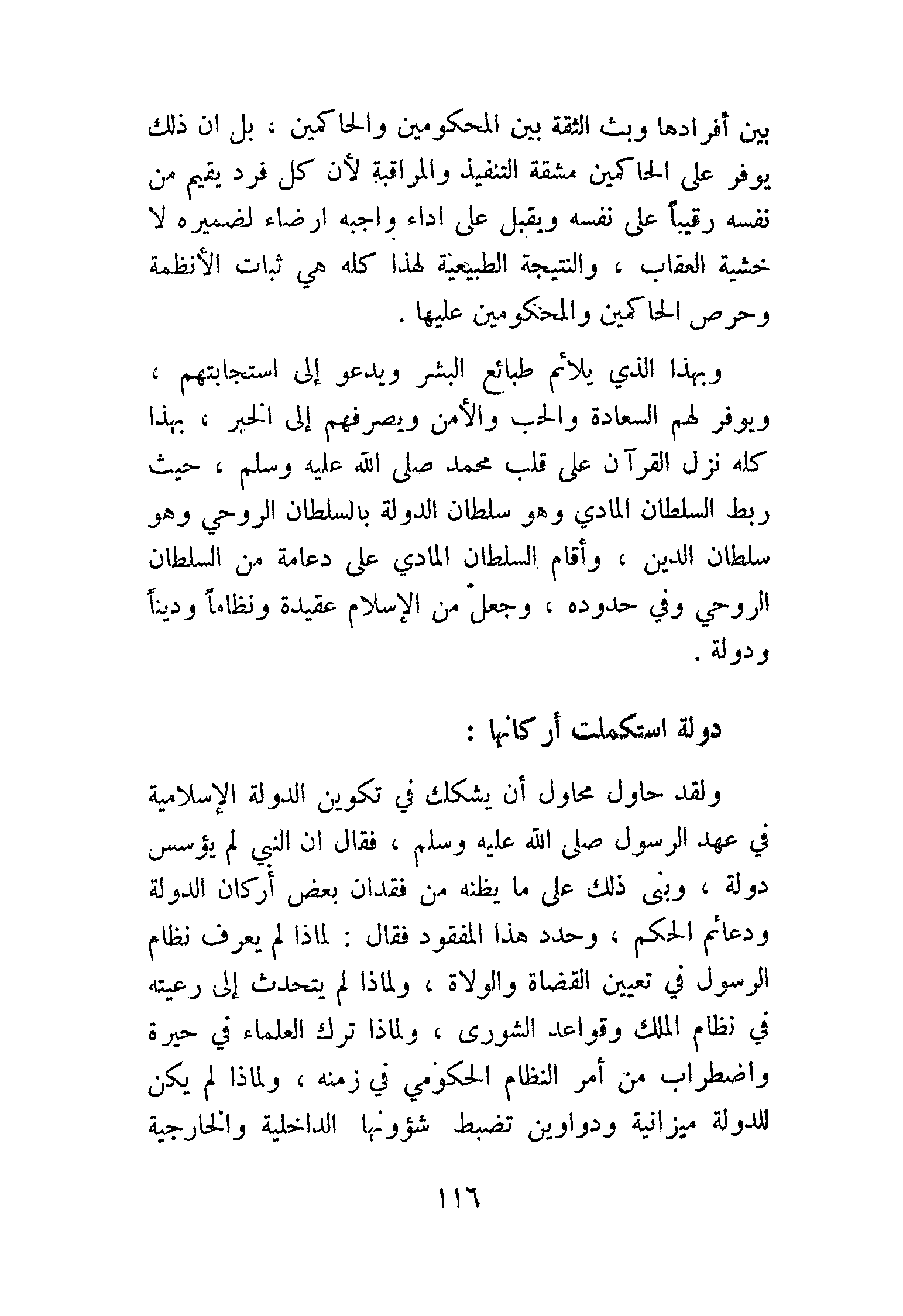 وبهذا الذي يلائم طبائع البشر ويدعو إلى استجوابتهم، ويوفر لهم السعادة والحب والأمن ويصرفهم إلى الخير، بهذا كله نزل القرآن على قلب مُحَمَّدٍ - صَلََّى اللهُ عَلَيْهِ وَسَلَّمَ -، حيث ربط السلطان المادي وهو سلطان الدولة بالسلطان الروحي وهو سلطان الدين، وأقام السلطان المادي على دعامة من السلطان الروحي وفي حدوده، وجعل من الإسلام عقيدة ونظامًا ودينًا ودولة.