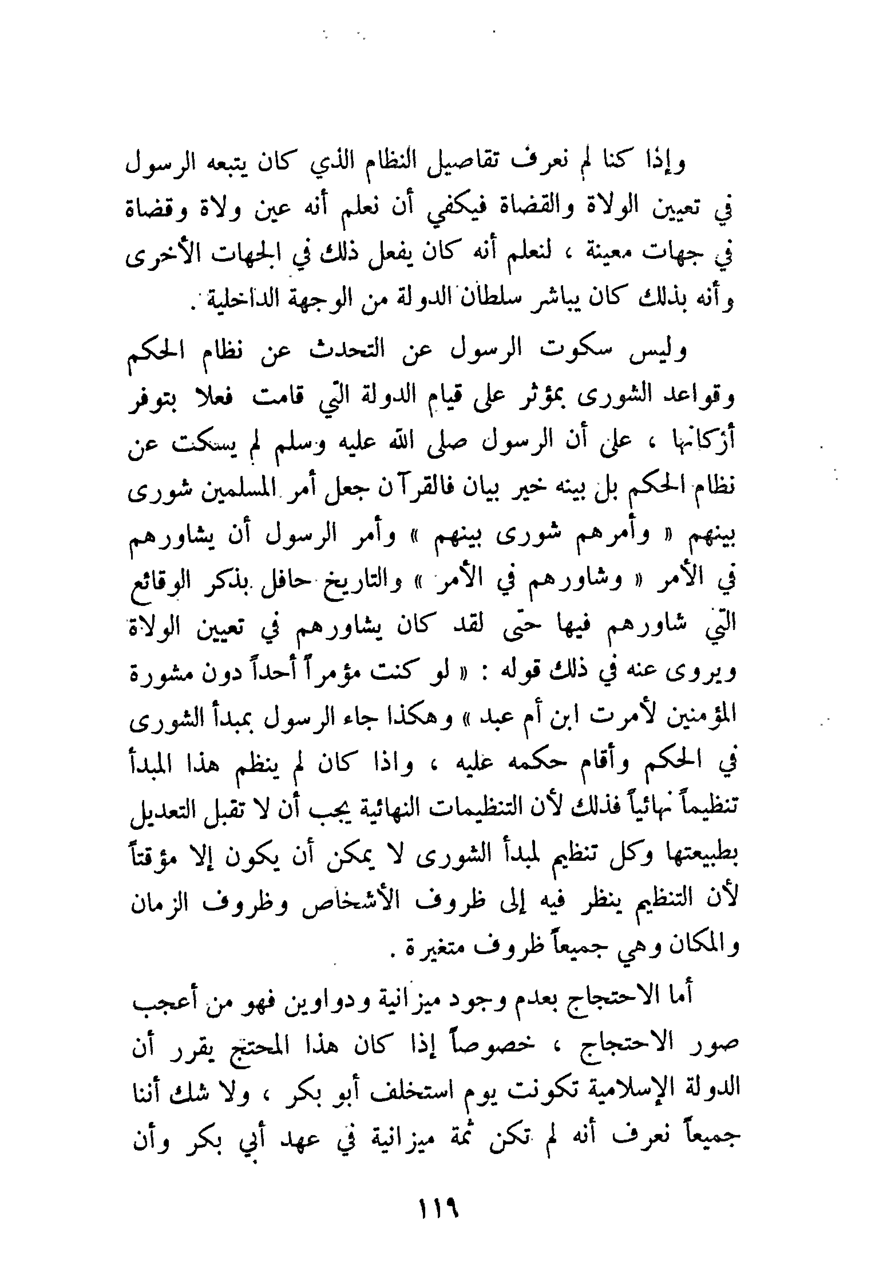 وليس سكوت الرسول عن التحدث عن نظام الحكم وقواعد الشورى بمؤثر على قيام الدولة التي قامت فعلاً بتوفر أركانها، على أن الرسول - صَلََّى اللهُ عَلَيْهِ وَسَلَّمَ - لم يسكت عن نظام الحكم بل بينه خير بيان فالقرآن جعل أمر المسلمين شورى بينهم {وَأَمْرُهُمْ شُورَى بَيْنَهُمْ} [الشورى: 38] وأمر الرسول أن يشاورهم في الأمر {وَشَاوِرْهُمْ فِي الأَمْرِ} [آل عمران: 159]. والتاريخ حافل بذكر الوقائع التي شاورهم فيها حتى لقد كان يشاورهم في تعيين الولاة ويروى عنه في ذلك قوله: «لَوْ كُنْتُ مُؤَمِّرًا أَحَدًا دُونَ مَشُورَةِ المُؤْمِنِينَ، لأَمَّرْتُ ابْنَ أُمِّ عَبْدٍ» وهكذا جاء الرسول بمبدأ الشورى في الحكم وإقامه حكمه عليه، وإذا كان لم ينظم هذا المبدأ تنظيمًا نهائيًا فذلك لأن التنظيمات النهائية يجب أن لا تقبل التعديل بطبيعتها وكل تنظيم لمبدأ الشورى لا يمكن أن يكون إلا مؤقتًا لأن التنظيم ينظر فيه إلى ظروف الأشخاص وظروف الزمان والمكان وهي جميعًا ظروف متغيرة.