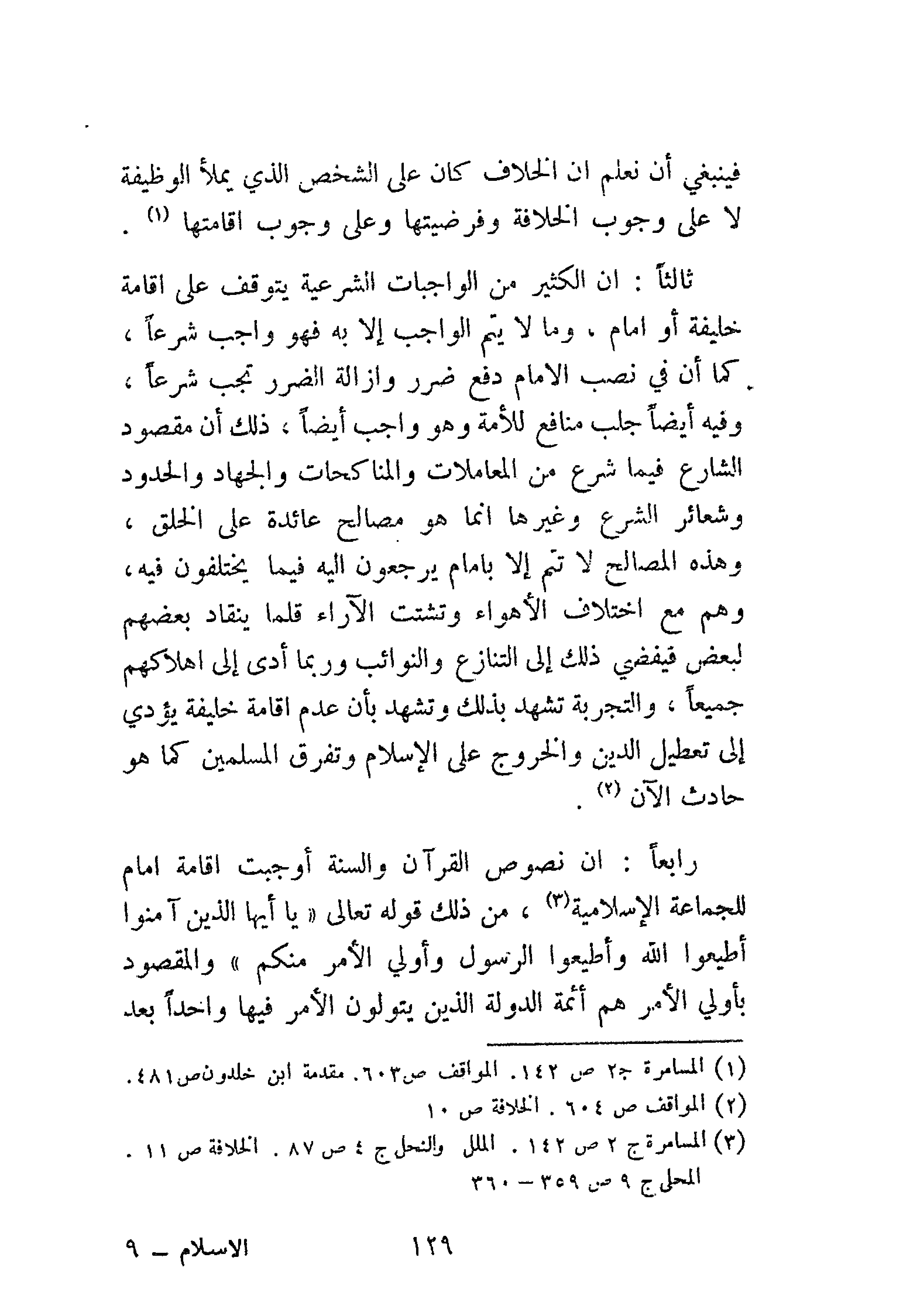 ثالثًا: إن الكثير من الواجبات الشرعية يتوقف على إقامة خليفة أو إمام، وما لا يتم الواجب إلا به فهو واجب شرعًا، كما أن في نصب الإمام دفع ضرر وإزالة الضرر تجب شرعًا، وفيه أيضًا جلب منافع للأمة وهو واجب أيضًا، ذلك أن مقصود الشارع فيما شرع من المعاملات والمناكحات والجهاد والحدود وشعائر الشرع وغيرها إنما هو مصالح عائدة على الخلق، وهذه المصالح لا تتم إلا بإمام يرجعون إليه فيما يختلفون فيه، وهم مع اختلاف الأهواء وتشتت الآراء قلما ينقاد بعضهم لبعض فيفضي ذلك إلى التنازع والنوائب وربما أدى إلى إهلاكهم جميعًا، والتجربة تشهد بذلك وتشهد بأن عدم إقامة خليفة يؤدي إلى تعطيل الدين والخروج على الإسلام وتفرق المسلمين كما هو حادث الآن (¬2).