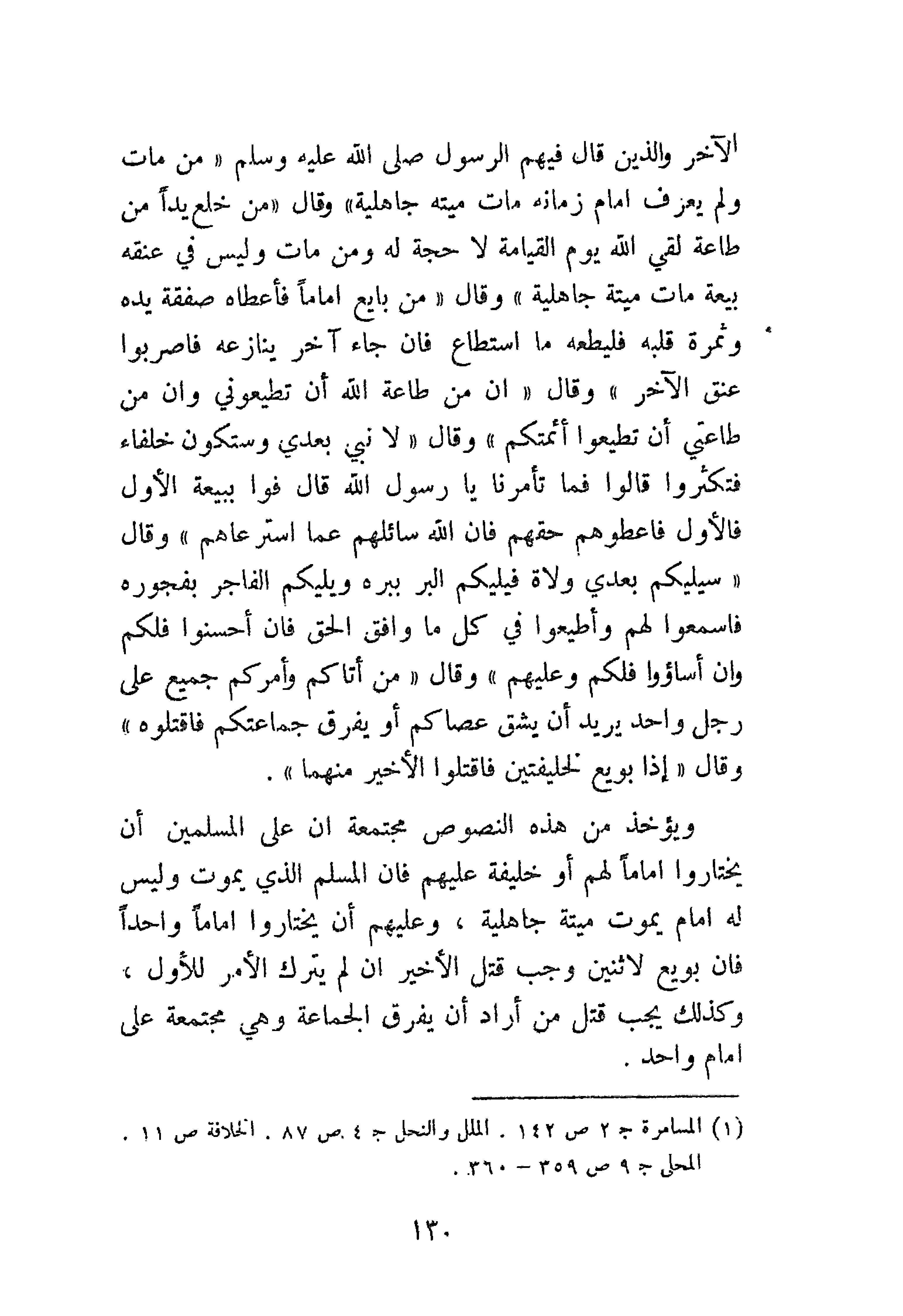 (¬1) " المسامرة ": جـ 2 ص 142، " الملل والنحل ": جـ 4 ص 87، " الخلافة ": ص 11، " المحلى ": جـ 9 ص 359، 360.