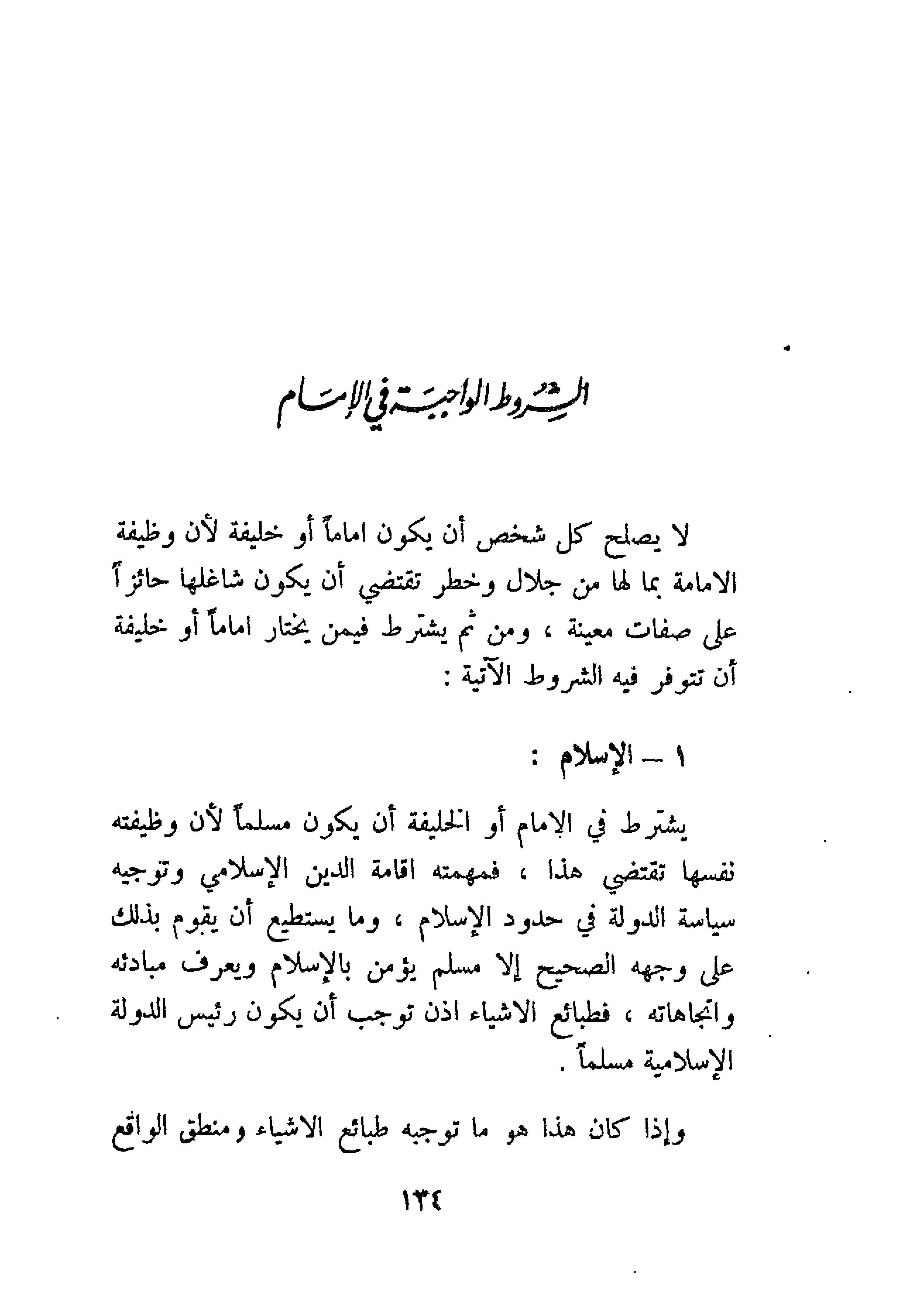 يشترط في الإمام أو الخليفة أن يكون مسلمًا لأن وظيفته نفسها تقتضي هذا، فمهمته إقامة الدين الإسلامي وتوجيه سياسة الدولة في حدود الإسلام، وما يستطيع أن يقوم بذلك على وجهه الصحيح إلا مسلم يؤمن بالإسلام ويعرف مبادئه واتجاهاته، فطبائع الأشياء إذن توجب أن يكون رئيس الدولة الإسلامية مسلمًا.