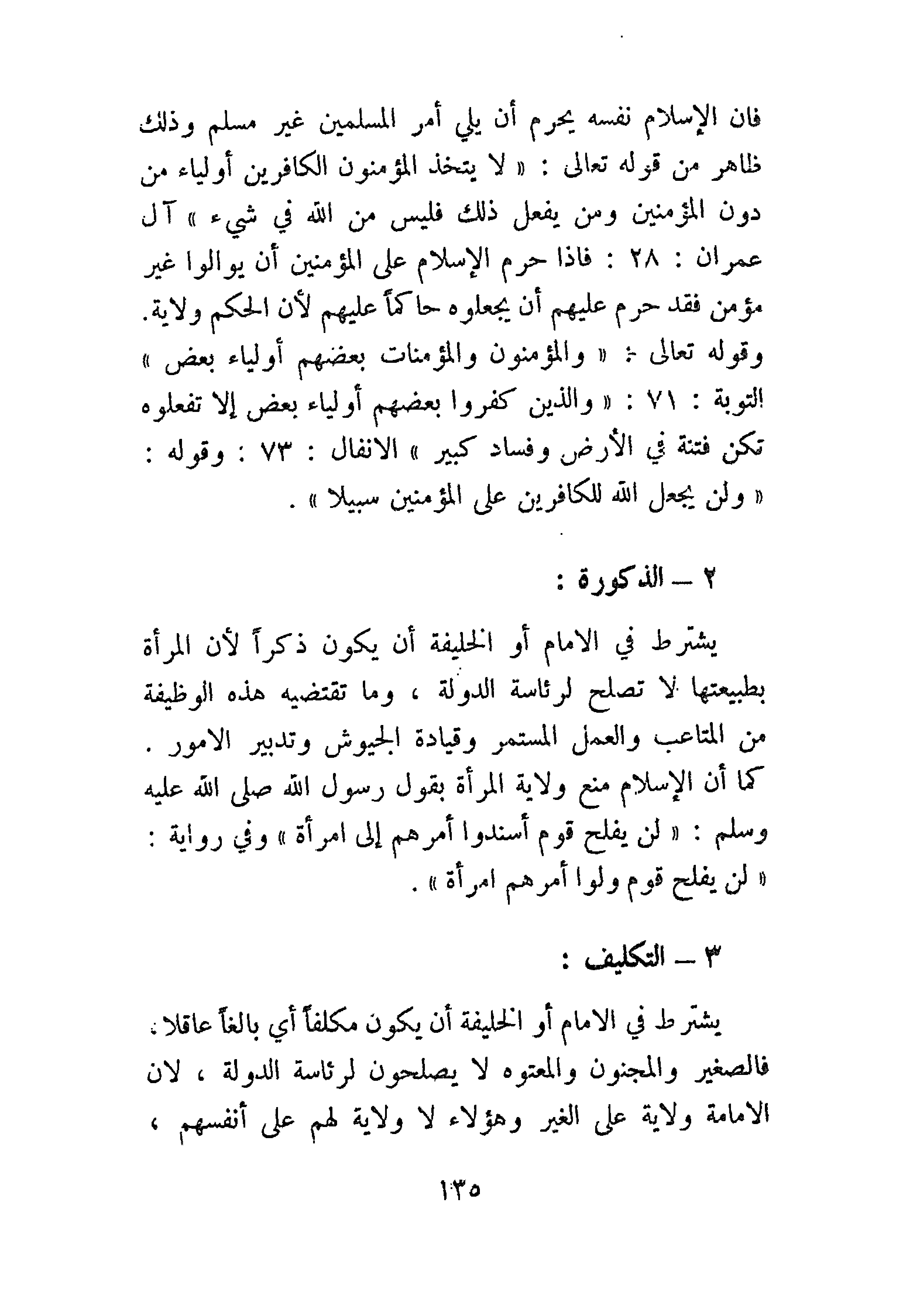 فإن الإسلام نفسه يحرم أن يلي أمر المسلمين غير مسلم وذلك ظاهر في قوله تعالى: {لاَ يَتَّخِذِ الْمُؤْمِنُونَ الْكَافِرِينَ أَوْلِيَاءَ مِنْ دُونِ الْمُؤْمِنِينَ وَمَنْ يَفْعَلْ ذَلِكَ فَلَيْسَ مِنَ اللَّهِ فِي شَيْءٍ} [آل عمران: 28]. فإذا حرم الإسلام على المؤمنين أن يوالوا غير مؤمن فقد حرم عليهم أن يجعلوه حاكمًا عليهم لأن الحكم ولاية. وقوله تعالى: {وَالْمُؤْمِنُونَ وَالْمُؤْمِنَاتُ بَعْضُهُمْ أَوْلِيَاءُ بَعْضٍ} [التوبة: 71]. وقوله: {وَالَّذِينَ كَفَرُوا بَعْضُهُمْ أَوْلِيَاءُ بَعْضٍ إِلاَّ تَفْعَلُوهُ تَكُنْ فِتْنَةٌ فِي الأَرْضِ وَفَسَادٌ كَبِيرٌ} [الأنفال: 73]. وقوله: {وَلَنْ يَجْعَلَ اللَّهُ لِلْكَافِرِينَ عَلَى الْمُؤْمِنِينَ سَبِيلاً} [النساء: 141].