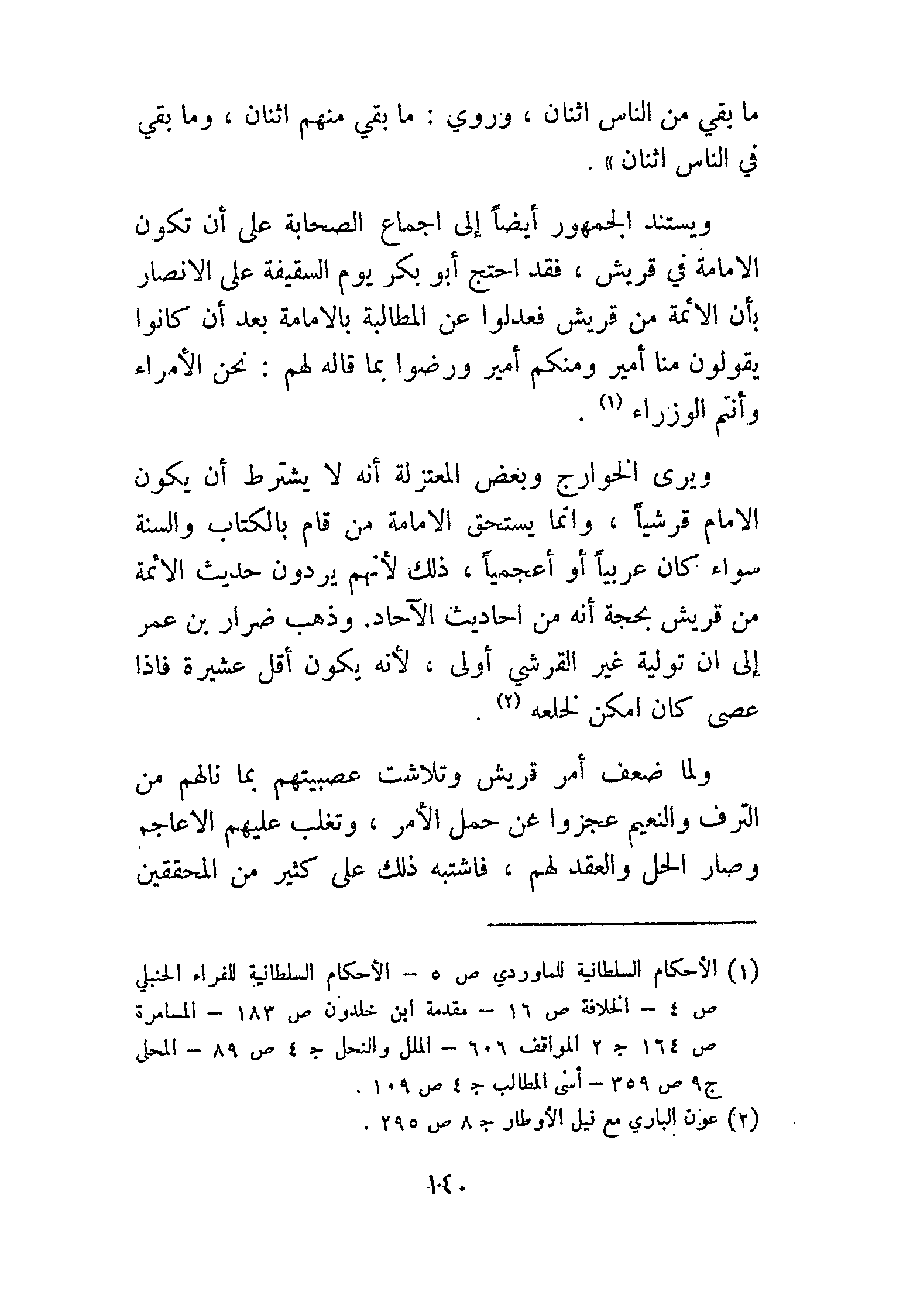(¬1) " الأحكام السلطانية " للماوردي: ص 5، " الأحكام السلطانية " للفراء الحنبلي: ص 4، " الخلافة ": ص 16، " مقدمة " ابن خلدون: ص 183، " المسامرة ": ص 164 جـ 2، " المواقف ": ص 606، " الملل والنحل ": جـ 4 ص 89، " المحلى ": جـ 9 ص 359، " أسنى المطالب ": جـ 4 ص 109.