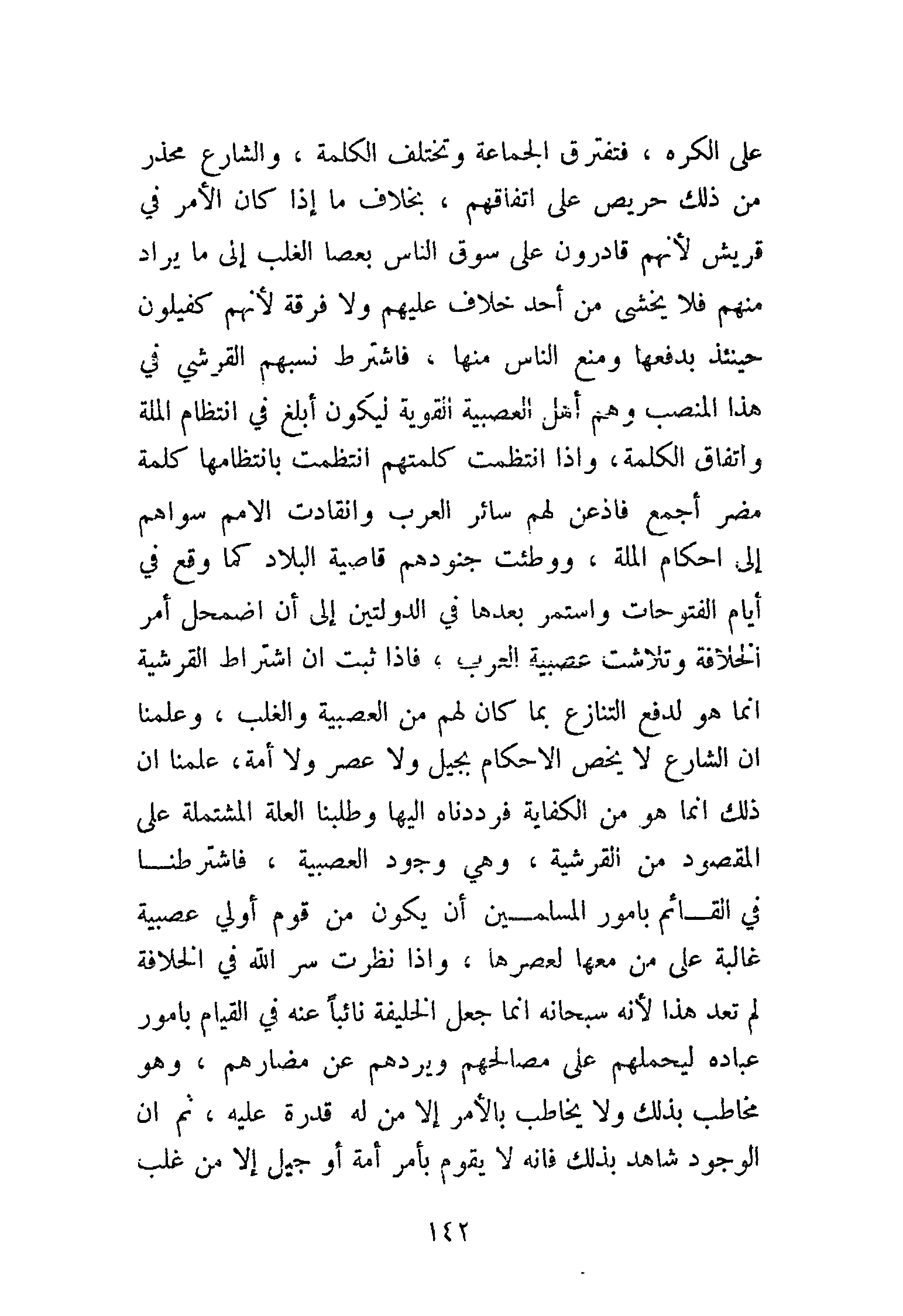 على الكره، فتفترق الجماعة وتختلف الكلمة، والشارع محذر من ذلك حريص على اتفاقهم، بخلاف ما إذا كان الأمر في قريش لأنهم قادرون على سوق الناس بعصا الغلب إلى ما يراد منهم فلا يخشى من أحد خلاف عليهم ولا فرقة لأنهم كفيلون حينئذٍ بدفعها ومنع الناس منها، فاشترط نسبهم القرشي في هذا المنصب وهم أهل العصبية القوية ليكون أبلغ في انتظام الملة واتفاق الكلمة، وإذا انتظمت كلمتهم انتظمت بانتظامها كلمة مضر أجمع فأذعن لهم سائر العرب وانقادت الأمم سواهم إلى أحكام الملة، ووطئت جنودهم قاصية البلاد كما وقع في أيام الفتوحات واستمر بعدها في الدولتين الى أن اضمحل أمر الخلافة وتلاشت عصبية العرب، فإذا ثبت أن اشتراط القرشية إنما هو لدفع التنازع بما كان لهم من العصبية والغلب، وعلمنا أن الشارع لا يخص الأحكام بجيل ولا عصر ولا أمة، علمنا أن ذلك إنما هو من الكفاية فرددناه إليها وطلبنا العلة المشتملة على المقصود من القرشية، وهي وجود العصبية، فاشترطنا في القائم بأمور المسلمين أن يكون من قوم أولي عصبية غالبة على من معها لعصرها، وإذا نظرت سِرَّ اللهِ في الخلافة لم تعد هذا لأنه سبحانه إنما جعل الخليفة نائبًا عنه في القيام بأمور عباده ليحملهم على مصالحهم ويردهم عن مضارهم، وهو مخاطب بذلك ولا يخاطب بالأمر إلا من له قدرة عليه، ثم إن الوجود شاهد بذلك فإنه لا يقوم بأمر أمة أو جيل إلا من غلب