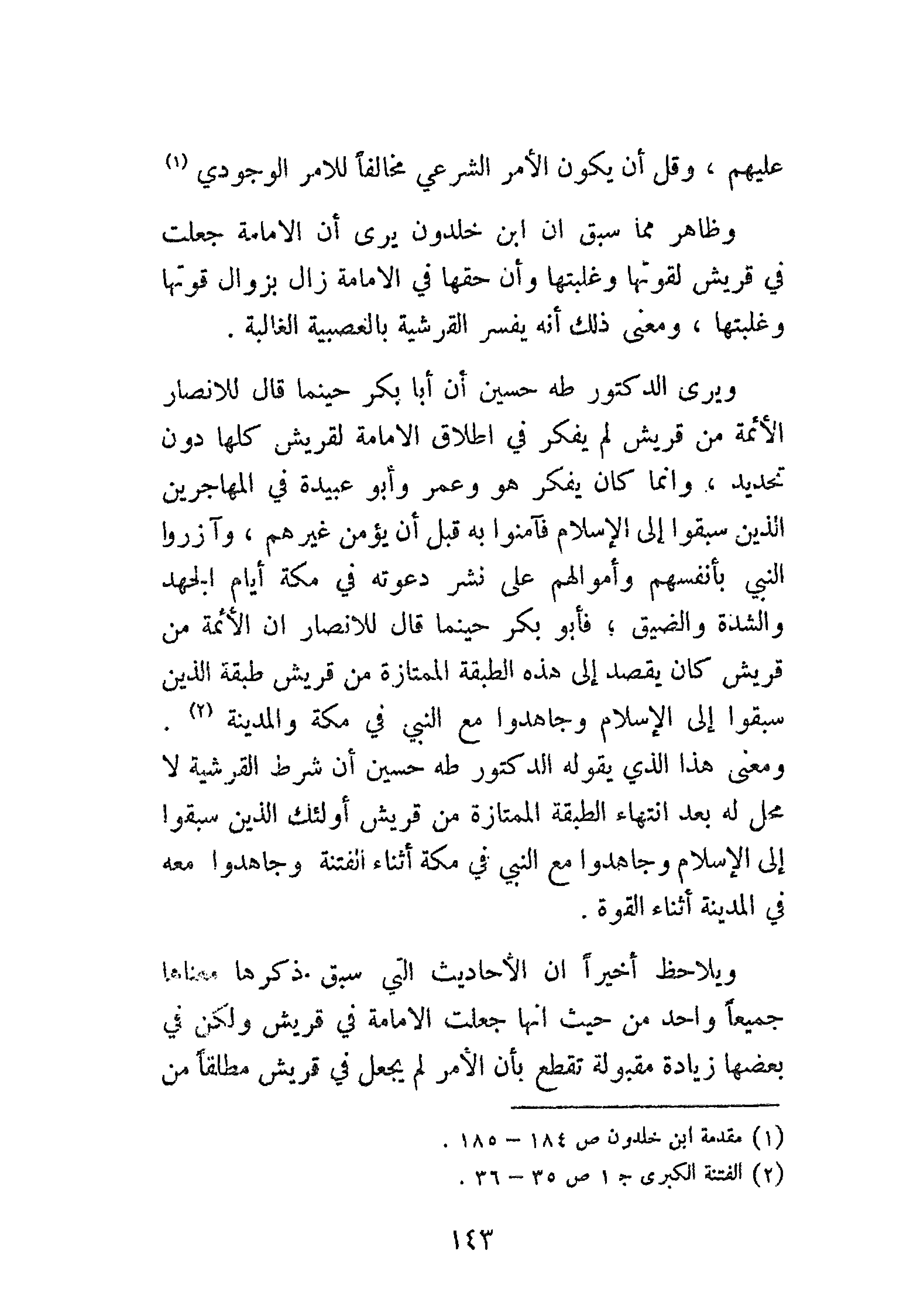 ويرى الدكتور طة حسين أن أبا بكر حينما قال للأنصار: «الأَئِمَّةُ مِنْ قُرَيْشٍ» لم يفكر في إطلاق الإمامة لقريش كلها دون تحديد، وإنما كان يفكر هو وعمر وأبو عبيدة في المهاجرين الذين سبقوا إلى الإسلام فآمنوا به قبل أن يؤمن غيرهم، وآزروا النبي بأنفسهم وأموالهم على نشر دعوته في مكة أيام الجهد والشدة والضيق، فأبو بكر حينما قال للأنصار أن الأئمة من قريش كان يقصد إلى هذه الطبقة الممتازة من قريش طبقة الذين سبقوا إلى الإسلام وجاهدوا مع النبي في مكة والمدينة (¬2). ومعنى هذا الذي يقوله الدكتور طة حسين أن شرط القرشية لا محل له بعد انتهاء الطبقة الممتازة من قريش أولئك الذين سبقوا إلى الإسلام وجاهدوا مع النبي في مكة أثناء الفتنة وجاهدوا معه في المدينة أثناء القوة.