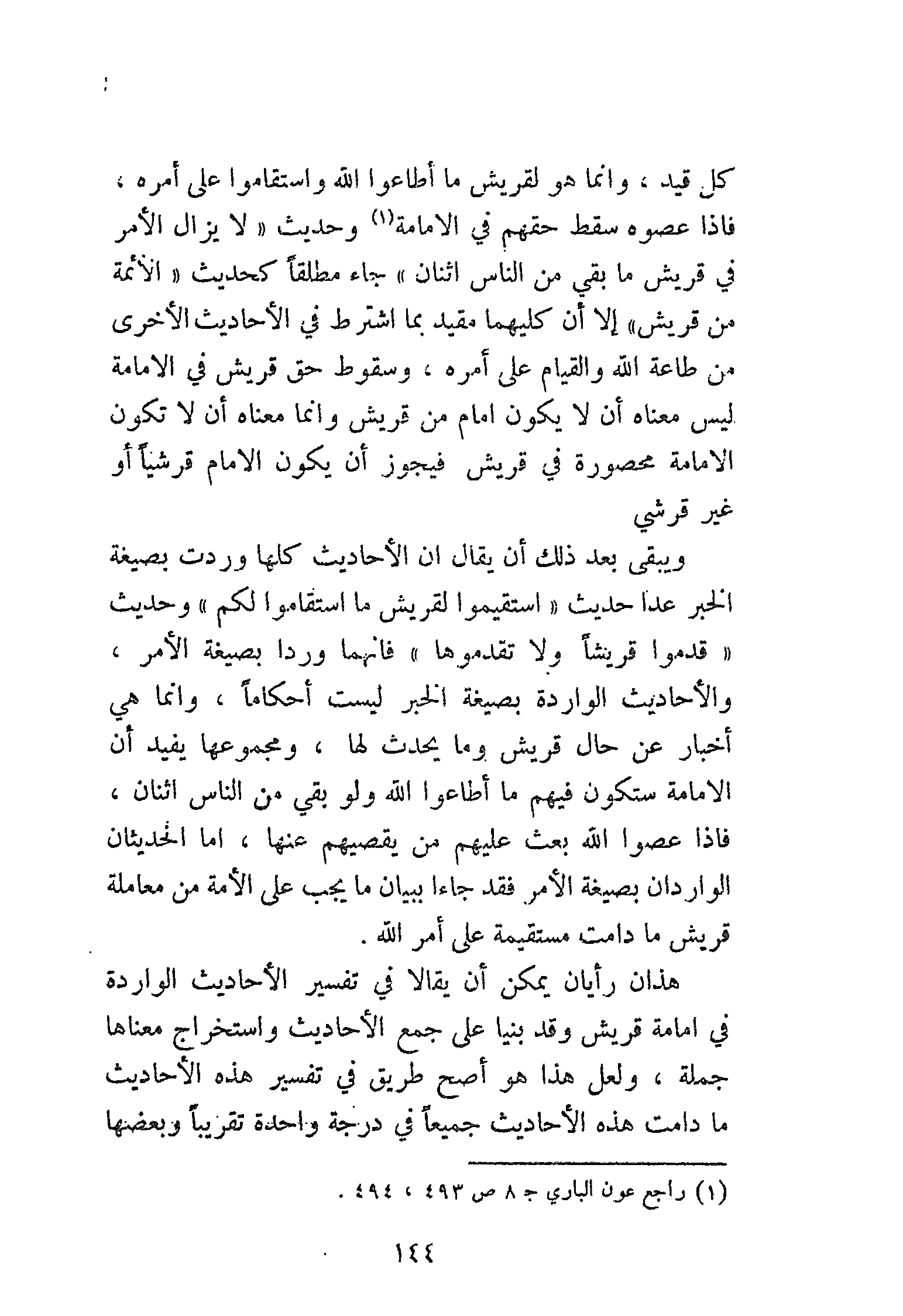 ويبقى بعد ذلك أن يقال إن الأحاديث كلها وردت بصيغة الخبر عدا حديث «اِسْتَقِيمُوا لِقُرَيْشٍ مَا اِسْتَقَامُوا لَكُمْ»، وحديث «قَدِّمُوا قُرَيْشًا وَلاَ تَقَدَّمُوهَا» فإنهما وَرَدَا بصيغة الأمر، والأحاديث الواردة بصيغة الخبر ليست أحكامًا، وإنما هي أخبار عن حال قريش وما يحدث لها، ومجموعها يفيد أن الإمامة ستكون فيهم ما أطاعوا الله ولو بقي من الناس اثنان، فإذا عصوا الله بعث عليهم من يقصيهم عنها، أما الحديثان الواردان بصيغة الأمر فقد جاءا ببيان ما يجب على الأمة من معاملة قريش ما دامت مستقيمة على أمر الله.