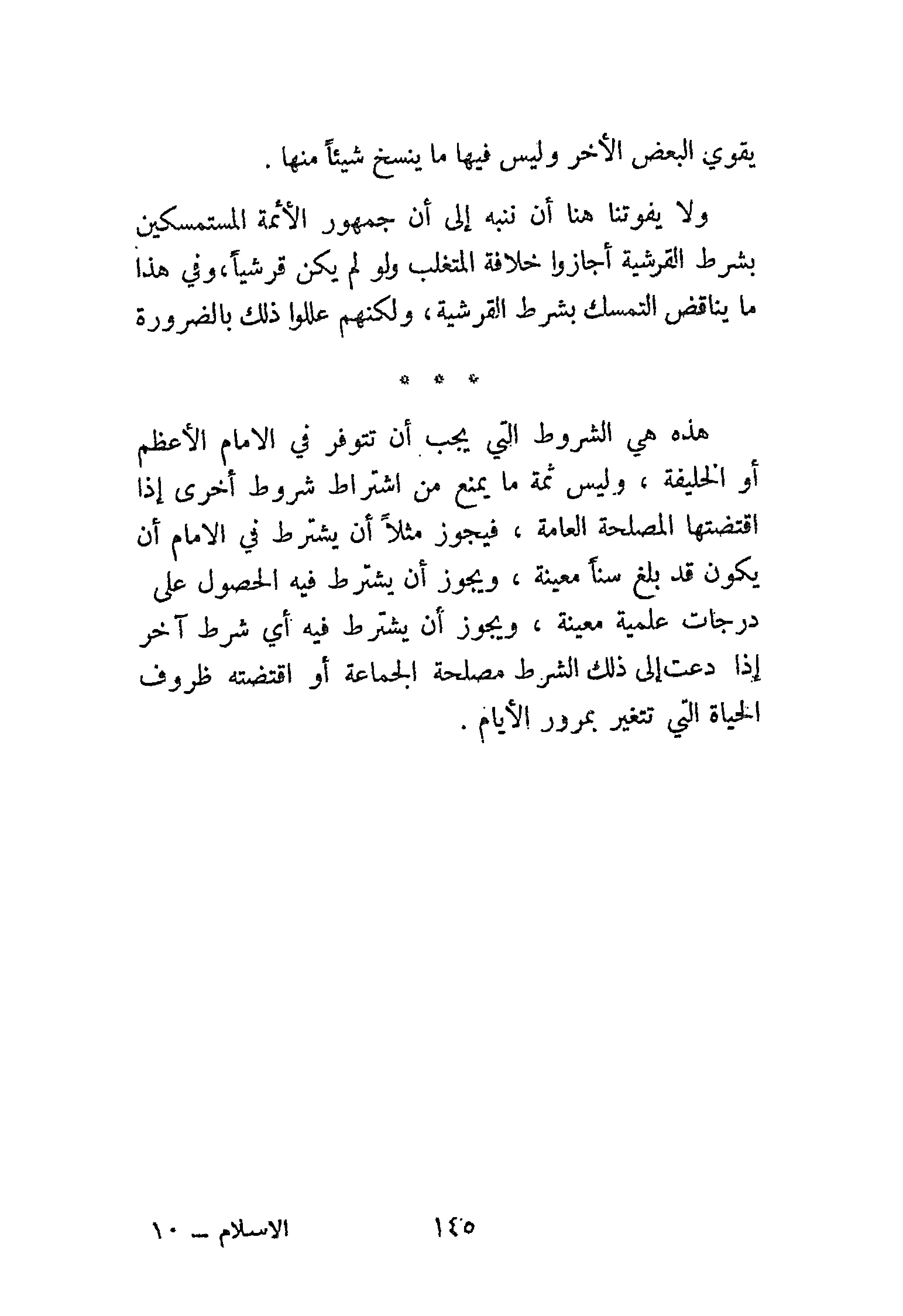 هذه هي الشروط التي يجب أن تتوفر في الإمام الأعظم أو الخليفة، وليس ثمة ما يمنع من اشتراط شروط أخرى إذا اقتضتها المصلحة العامة، فيجوز مثلاً أن يشترط في الإمام أن يكون قد بلغ سِنًّا معينة، ويجوز أن يشترط فيه الحصول على درجات علمية معينة، ويجوز أن يشترط فيه أي شرط آخر إذا دعت لذلك الشرط مصلحة الجماعة أو اقتضته ظروف الحياة التي تتغير بمرور الأيام.