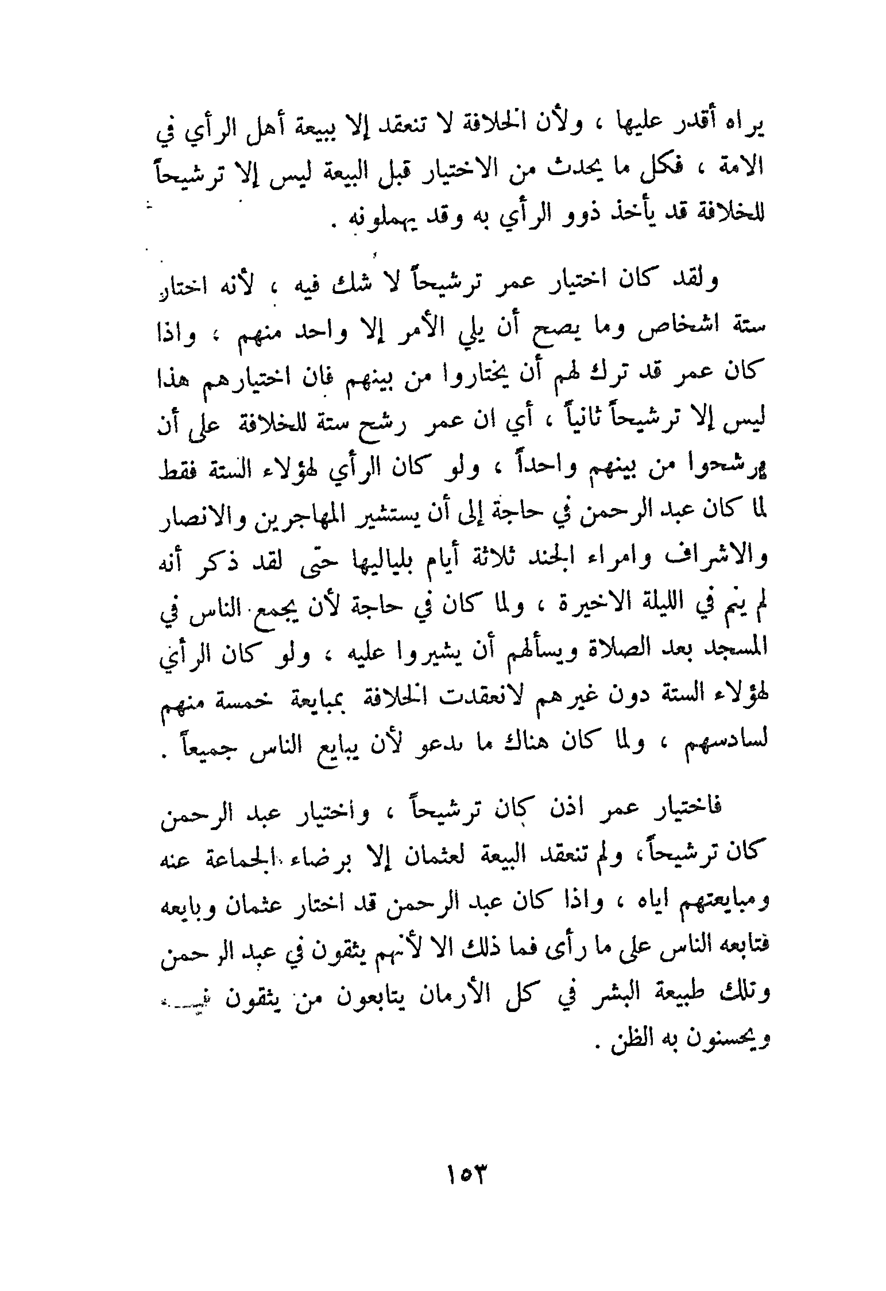 ولقد كان اختيار عمر ترشيحًا لا شك فيه، لأنه اختار ستة أشخاص وما يصح أن يلي الأمر إلا واحد منهم، وإذا كان عمر قد ترك لهم أن يختاروا من بينهم فإن اختيارهم هذا ليس إلا ترشيحًا ثانيًا، أي أن عمر رشح ستة للخلافة على أن يرشحوا من بينهم واحدًا، ولو كان الرأي لهؤلاء الستة فقط لما كان عبد الرحمن في حاجة إلى أن يستشير المهاجرين والأنصار والأشراف وأمراء الجند ثلاثة أيام بلياليها حتى لقد ذكر أنه لم ينم في الليلة الأخيرة، ولما كان في حاجة لأن يجمع الناس في المسجد بعد الصلاة ويسألهم أن يشيروا عليه، ولو كان الرأي لهؤلاء الستة دون غيرهم لانعقدت الخلافة بمبايعة خمسة منهم لسادسهم، ولما كان هناك ما يدعو لأن يبايع الناس جميعًا.
