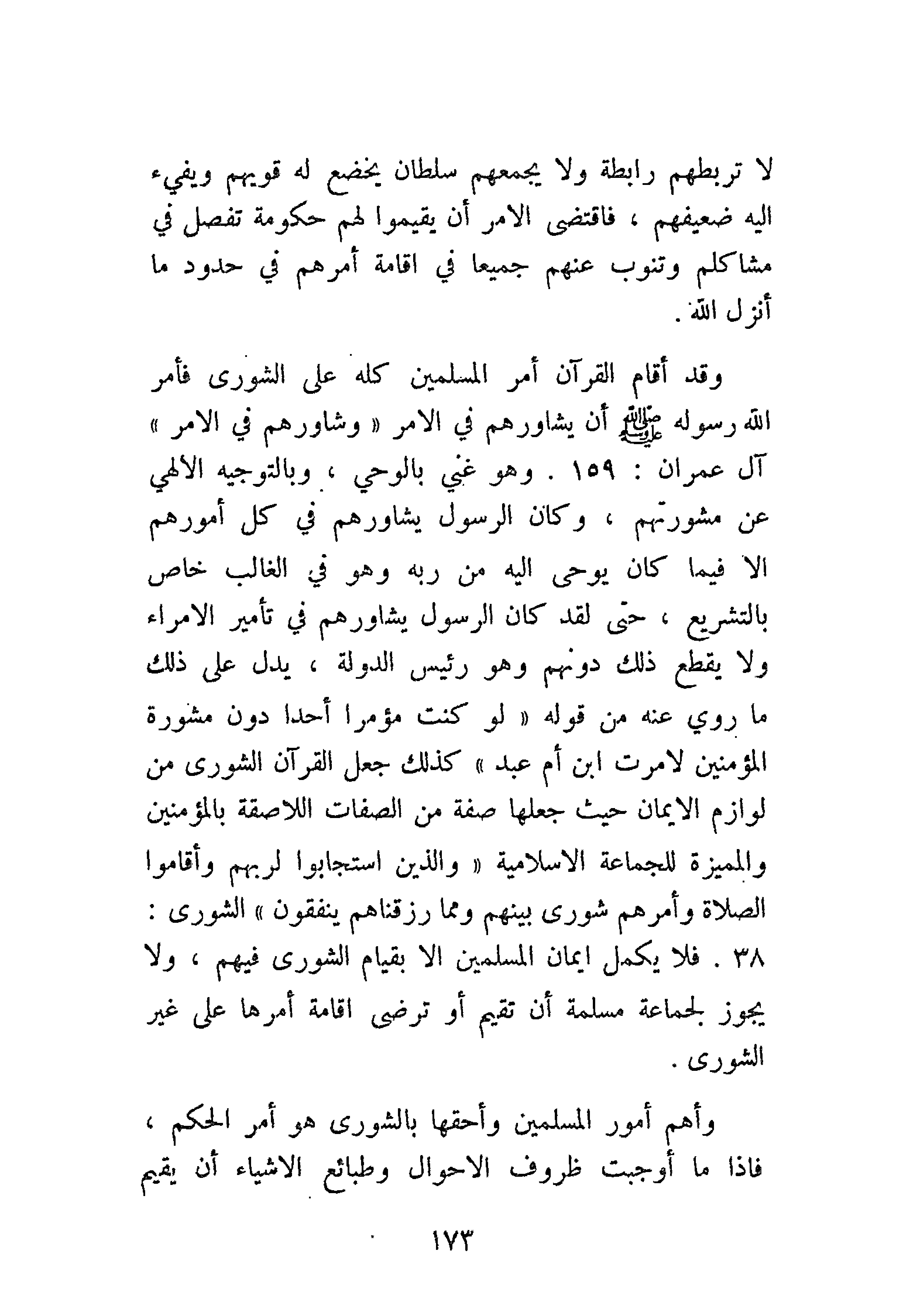 وأهم المسلمين وأحقها بالشورى هو أمر الحكم، فإذا ما أوجبت ظروف الأحوال وطبائع الأشياء أن يقيم