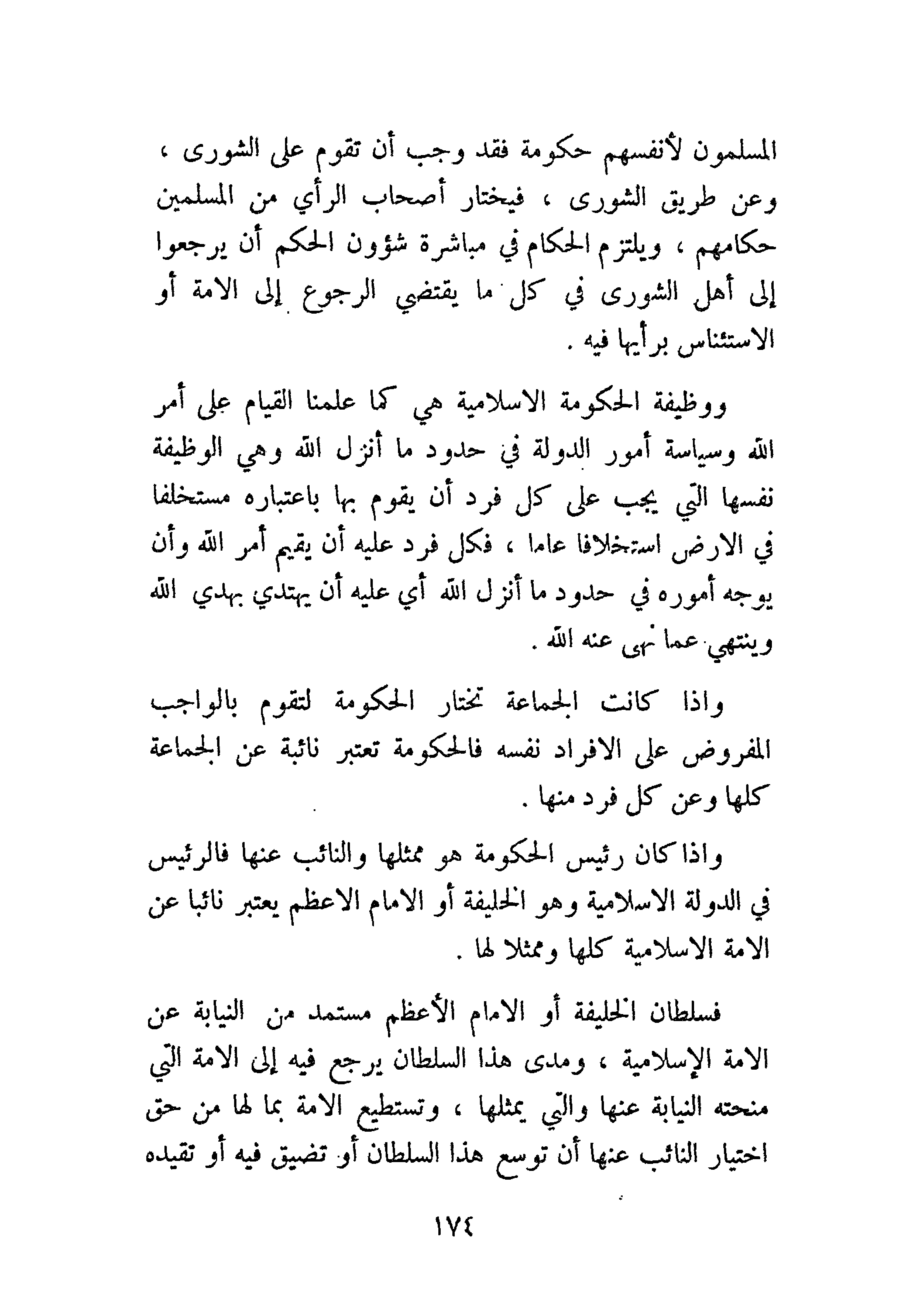 المسلمون لأنفسهم حكومة فقد وجب أن تقوم على الشورى، وعن طريق الشورى، فيختار أصحاب الرأي من المسلمين حكامها، ويلتزم الحكام في مباشرة شؤون الحكم أن يرجعوا إلى أهل الشورى في كل ما يقتضي الرجوع إلى الأمة أو الاستئناس برأيها فيه.