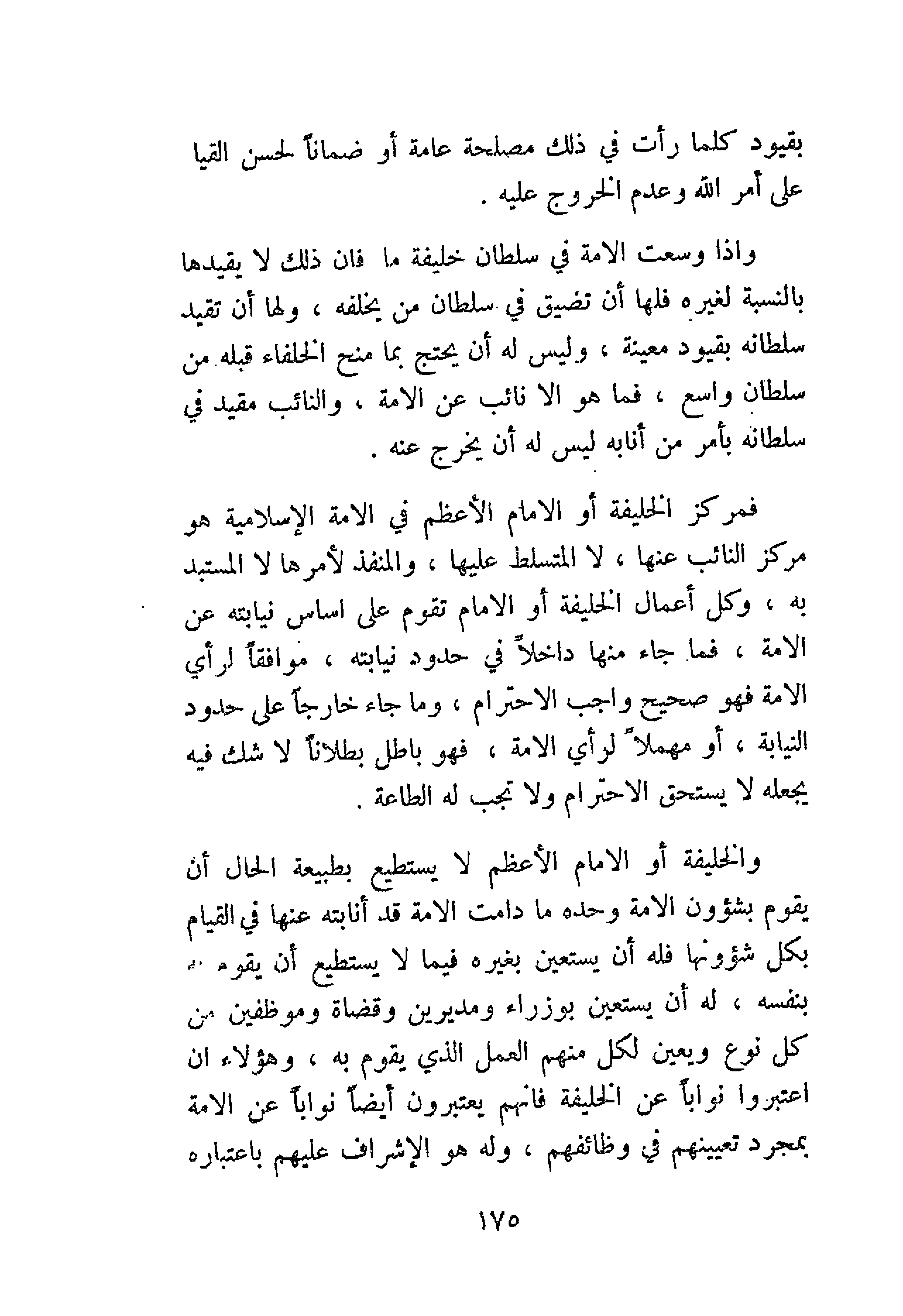 فمركز الخليفة أو الإمام الأعظم في الأمة الإسلامية هو مركز النائب عنها، لا المتسلط عليها، والمنفذ لأمرها لا المستبد به، وكل أعمال الخليفة أو الإمام تقوم على أساس نيابته عن الأمة، فما جاء منها داخلاً في حدود نيابته، موافقًا لرأي الأمة فهو صحيح واجب الاحترام، وما جاء خارجًا على حدود النيابة، أو مُهْمِلاً لرأي الأمة، فهو باطل بطلانًا لا شك يجعله لا يستحق الاحترام ولا تجب له الطاعة.
