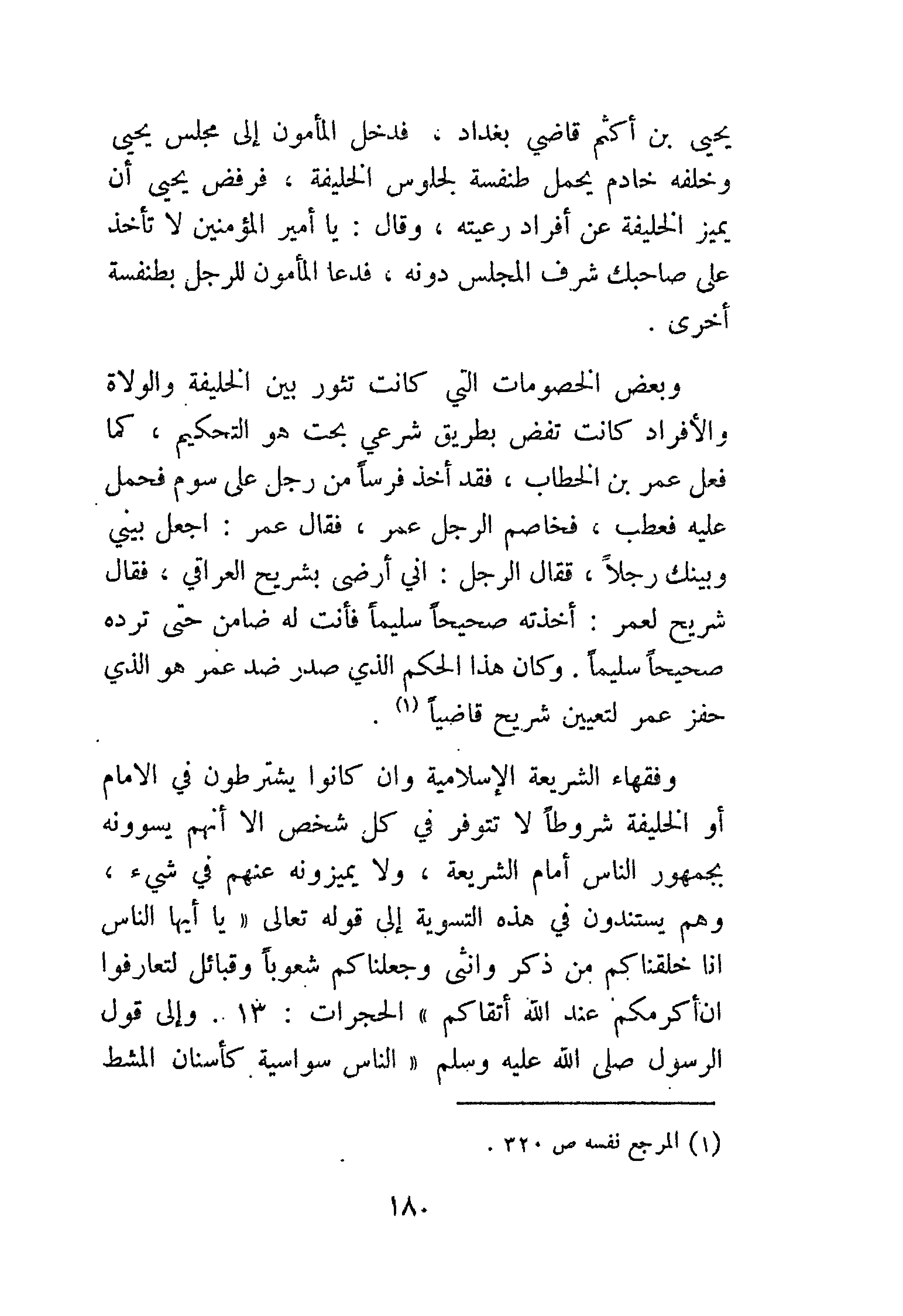 وفقهاء الشريعة الإسلامية وإن كانوا يشترطون في الإمام أو الخليفة شروطًا لا تتوفر في كل شخص إلا أنهم يسوونه بجمهور الناس أمام الشريعة، ولا يميزونه عنهم في شيء، وهم يستندون في هذه التسوية إلى قوله تعالى {يَا أَيُّهَا النَّاسُ إِنَّا خَلَقْنَاكُمْ مِنْ ذَكَرٍ وَأُنْثَى وَجَعَلْنَاكُمْ شُعُوبًا وَقَبَائِلَ لِتَعَارَفُوا إِنَّ أَكْرَمَكُمْ عِنْدَ اللَّهِ أَتْقَاكُمْ إِنَّ اللَّهَ عَلِيمٌ خَبِيرٌ} [الحجرات: 13]. وإلى قول الرسول - صَلََّى اللهُ عَلَيْهِ وَسَلَّمَ - «النَّاسُ سَوَاسِيَةٌ كَأَسْنَانِ المُشْطِ
