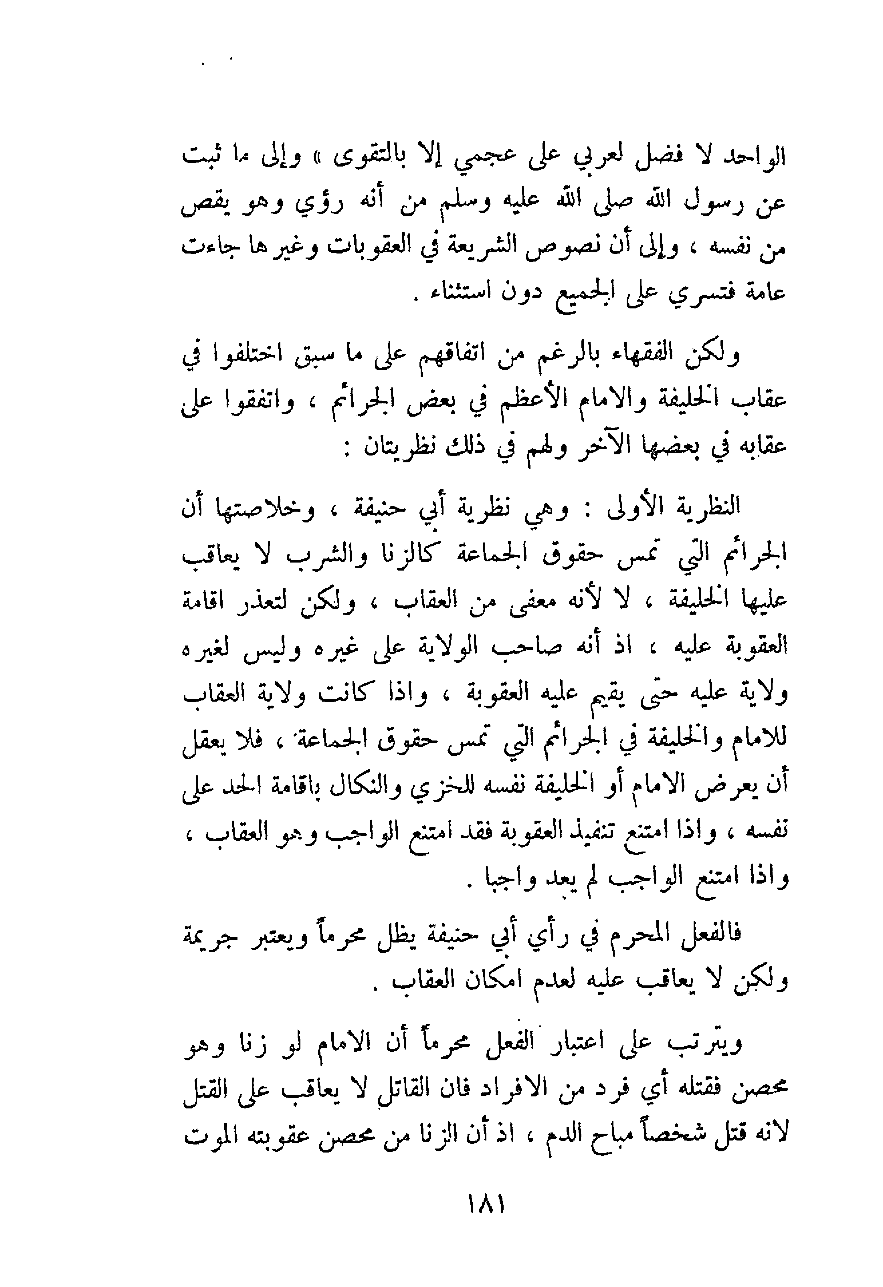 النظرية الأولى: وهي نظرية أبي حنيفة، وخلاصتها أن الجرائم التي تمس حقوق الجماعة كالزنا والشرب لا يعاقب عليها الخليفة، لا لأنه معفى من العقاب ولكن لتعذر إقامة العقوبة عليه، إذ أنه صاحب الولاية على غيره وليس لغيره ولاية عليه حتى يقيم عليه العقوبة، وإذا كانت ولاية العقاب للإمام والخليفة في الجرائم التي تمس حقوق الجماعة، فلا يعقل أن يعرض الإمام نفسه للخزي والنكال بإقامة الحد على نفسه، وإذا امتنع تنفيذ العقوبة فقد امتنع الواجب وهو العقاب، وإذا امتنع الواجب لم يعد واجبًا.