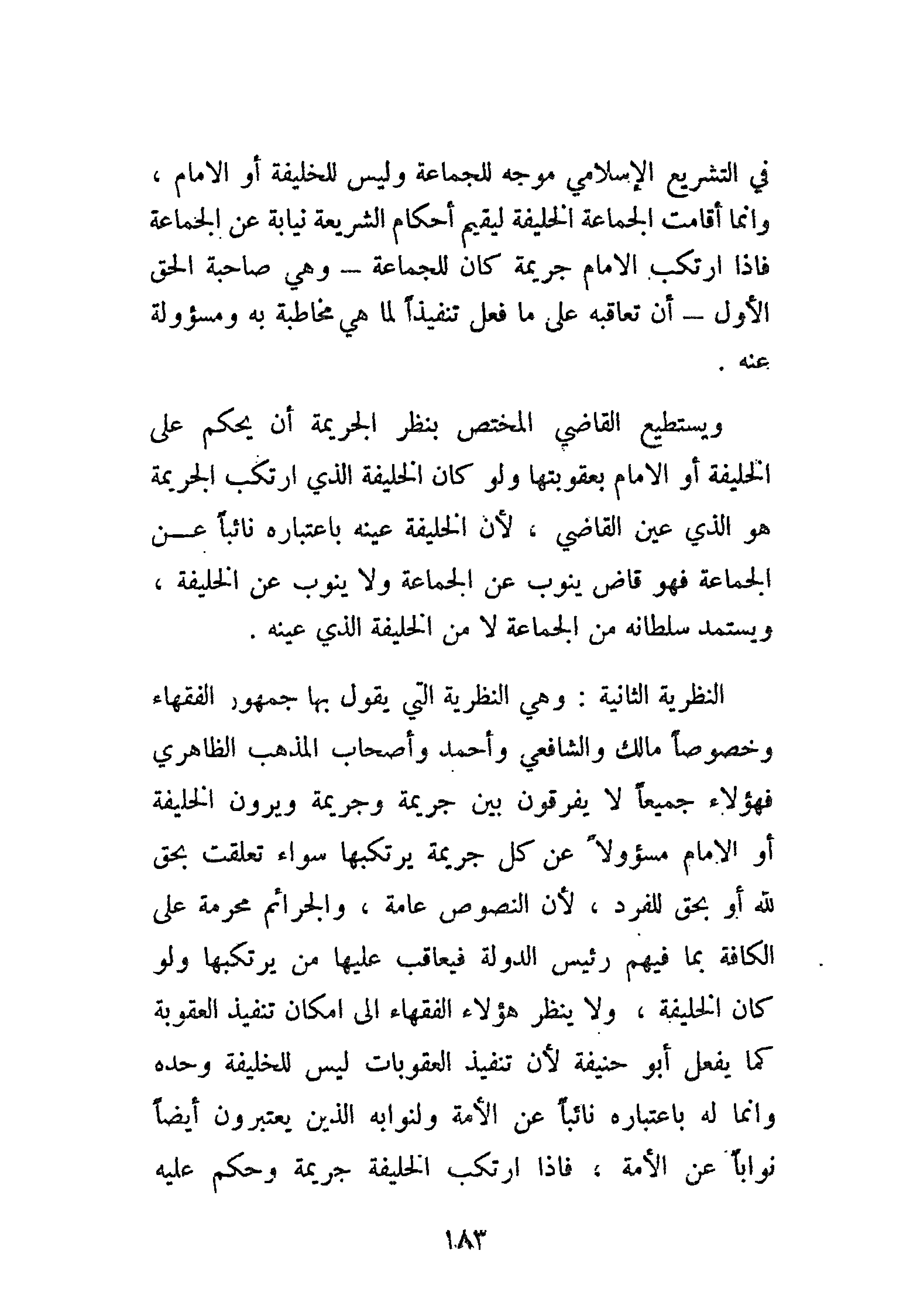 النظرية الثانية: وهي النظرية التي يقول بها جمهور الفقهاء وخصوصًا مالك والشافعي وأحمد وأصحاب المذهب الظاهري فهؤلاء جميعًا لا يفرقون بين جريمة وجريمة ويرون الخليفة أو الإمام مسؤولاً عن كل جريمة يرتكبها سواء تعلقت بحق الله أو بحق للفرد، لأن النصوص عامة، والجرائم محرمة على الكافة بما فيهم رئيس الدولة فيعاقب عليها من يرتكبها ولو كان الخليفة، ولا ينظر هؤلاء الفقهاء إلى إمكان تنفيذ العقوبة كما يفعل أبو حنيفة لأن تنفيذ العقوبات ليس للخليفة وحده وإنما له باعتباره نائبًا عن الأمة ولنوابه الذين يعتبرون أيضًا نوابًا عن الأمة، فإذا ارتكب الخليفة جريمة وحكم عليه
