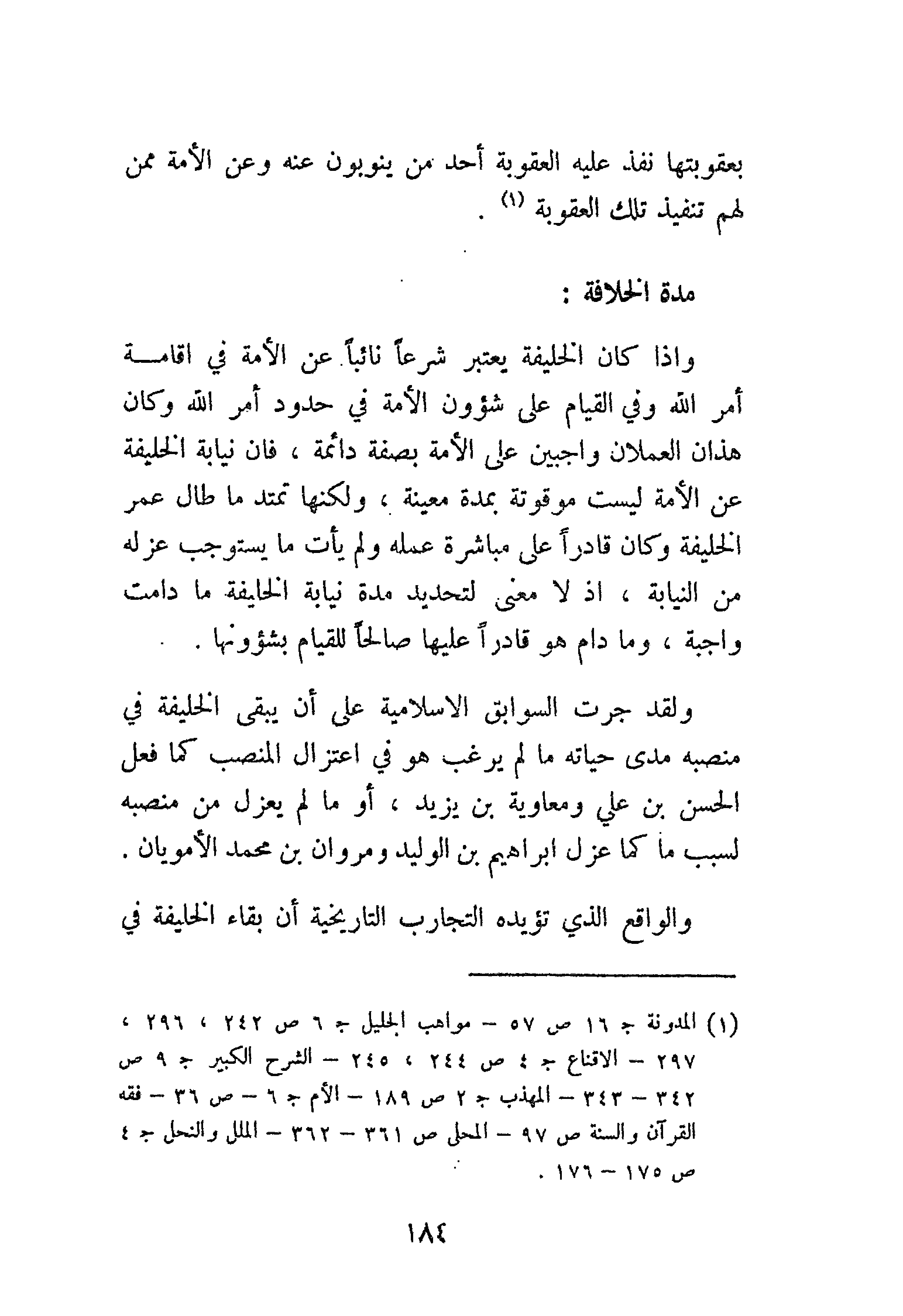 وإذا كان الخليفة يعتبر شرعًا نائبًا عن الأمة في إقامة أمر الله وفي القيام على شؤون الأمة في حدود أمر الله وكان هذان العملان واجبين على الأمة بصفة دائمة، فإن نيابة الخليفة عن الأمة ليست موقوتة بمدة معينة، ولكنها تمتد ما طال عمر الخليفة وكان قادرًا على مباشرة عمله ولم يأت بما يستوجب عزله من النيابة، إذ لا معنى لتحديد مدة نيابة الخليفة ما دامت واجبة، وما دام هو قادرًا عليها صالحًا للقيام بشؤونها.