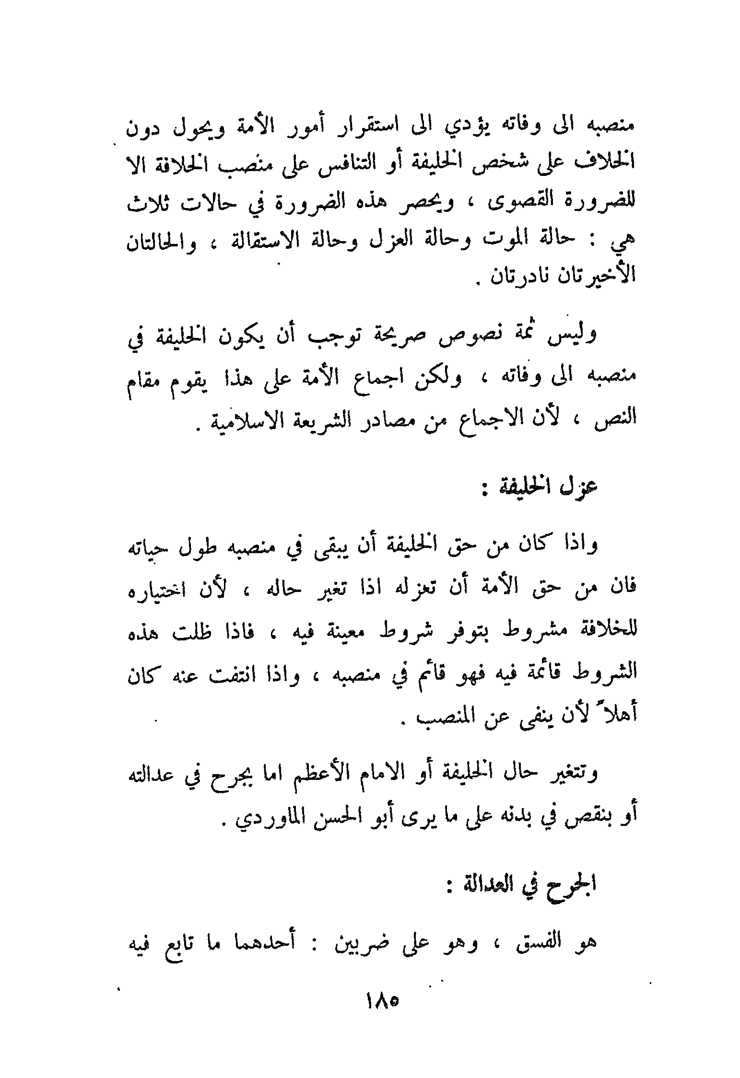 منصبه إلى وفاته يؤدي إلى استقرار أمور الأمة وَيَحُولُ دون الخلاف على شخص الخليفة أو التنافس على منصب الخلافة إلا للضرورة القصوى، ويحصر هذه الضرورة في حالات ثلاث هي: حالة الموت وحالة العزل وحالة الاستقالة، والحالتان الأخيرتان نادرتان.