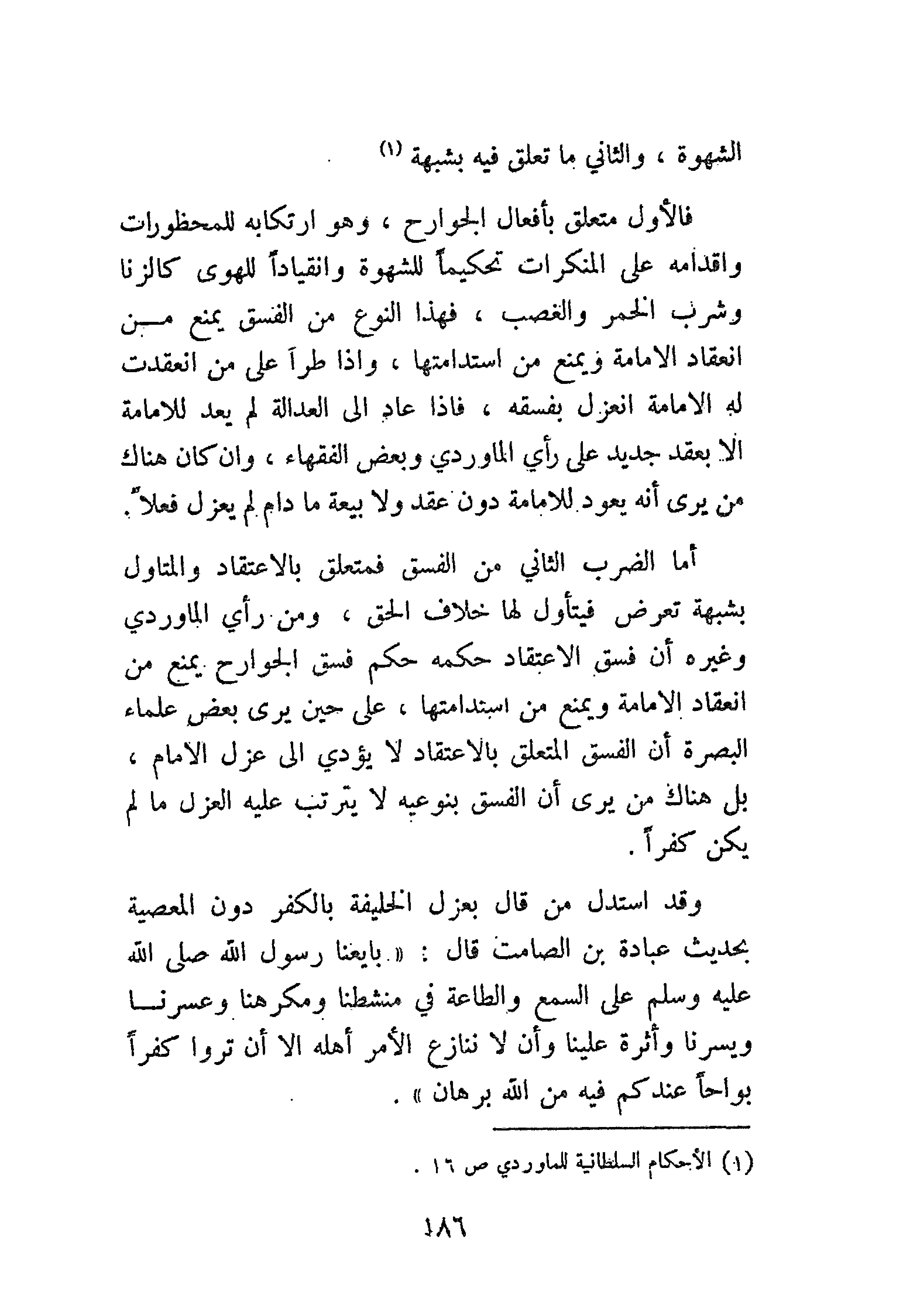وقد استدل من قال بعزل الخليفة بالكفر دون المعصية بحديث عُبادة بن الصامت قال: «بَايَعْنَا رَسُولَ اللهِ - صَلََّى اللهُ عَلَيْهِ وَسَلَّمَ -, عَلَى السَّمْعِ وَالطَّاعَةِ فِي مَنْشَطِنَا وَمَكْرَهِنَا وَعُسْرِنَا وَيُسْرِنَا , وَأَثَرَةً عَلَيْنَا , وَأَنْ لاَ نُنَازِعَ الأَمْرَ أَهْلَهُ، إِلاَّ أَنْ تَرَوْا كُفْرًا بَوَاحًا , عِنْدَكُمْ مِنَ اللهِ فِيهِ بُرْهَانٌ».
