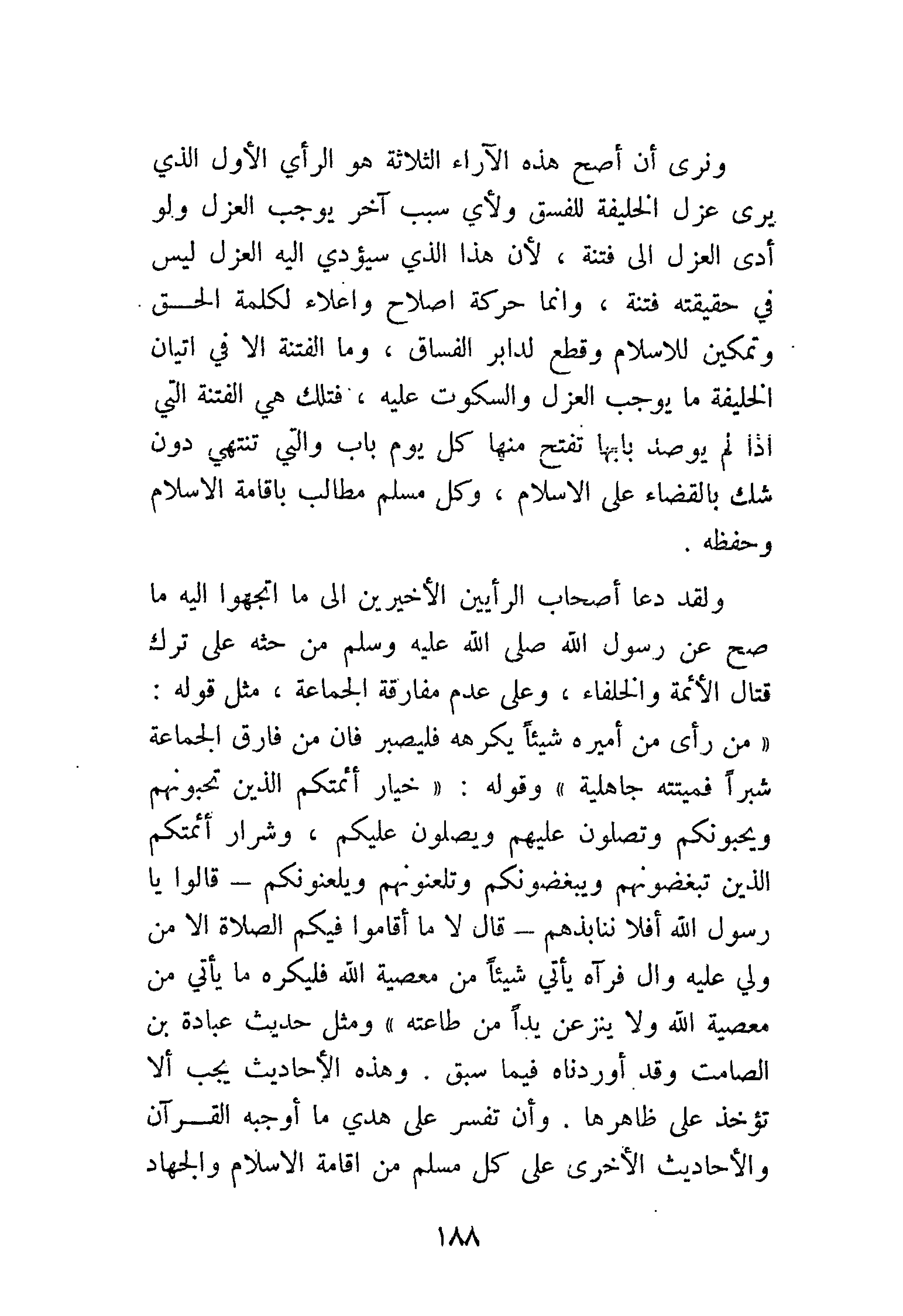 ولقد دعا أصحاب الرأيين الأخيرين إلى ما اتجهوا إليه ما صح عن رسول الله - صَلََّى اللهُ عَلَيْهِ وَسَلَّمَ - من حثه على ترك قتال الأئمة والخلفاء، وعلى عدم مفارقة الجماعة، مثل قوله: «مَنْ رَأَى مِنْ أَمِيرِهِ شَيْئًا يَكْرَهُهُ فَلْيَصْبِرْ، فَإِنَّهُ مَنْ فَارَقَ الجَمَاعَةَ شِبْرًا، فَمَاتَ، فَمِيتَتُهُ جَاهِلِيَّةٌ» وقوله: «خِيَارُ أَئِمَّتِكُمُ الَّذِينَ تُحِبُّونَهُمْ وَيُحِبُّونَكُمْ، وَتُصَلُّونَ عَلَيْهِمْ وَيُصَلُّونَ عَلَيْكُمْ، وَشِرَارُ أَئِمَّتِكُمُ الذِينَ تُبْغِضُونَهُمْ وَيُبْغِضُونَكُمْ، وَتَلْعَنُونَهُمْ وَيَلْعَنُونَكُمْ»، قَالُوا: قُلْنَا: يَا رَسُولَ اللهِ، أَفَلاَ نُنَابِذُهُمْ عِنْدَ ذَلِكَ؟ قَالَ: «لاَ، مَا أَقَامُوا فِيكُمُ الصَّلاَةَ، لاَ، مَا أَقَامُوا فِيكُمُ الصَّلاَةَ، أَلاَ مَنْ وَلِيَ عَلَيْهِ وَالٍ، فَرَآهُ يَأْتِي شَيْئًا مِنْ مَعْصِيَةِ اللهِ، فَلْيَكْرَهْ مَا يَأْتِي مِنْ مَعْصِيَةِ اللهِ، وَلاَ يَنْزِعَنَّ يَدًا مِنْ طَاعَةٍ» (*) ومثل حديث عبادة بن الصامت وقد أوردناه فيما سبق. وهذه الأحاديث يجب ألا تؤخذ على ظاهرها. وأن تفسر على هدى ما أوجبه القرآن والأحاديث الأخرى على كل مسلم من إقامة الإسلام والجهاد