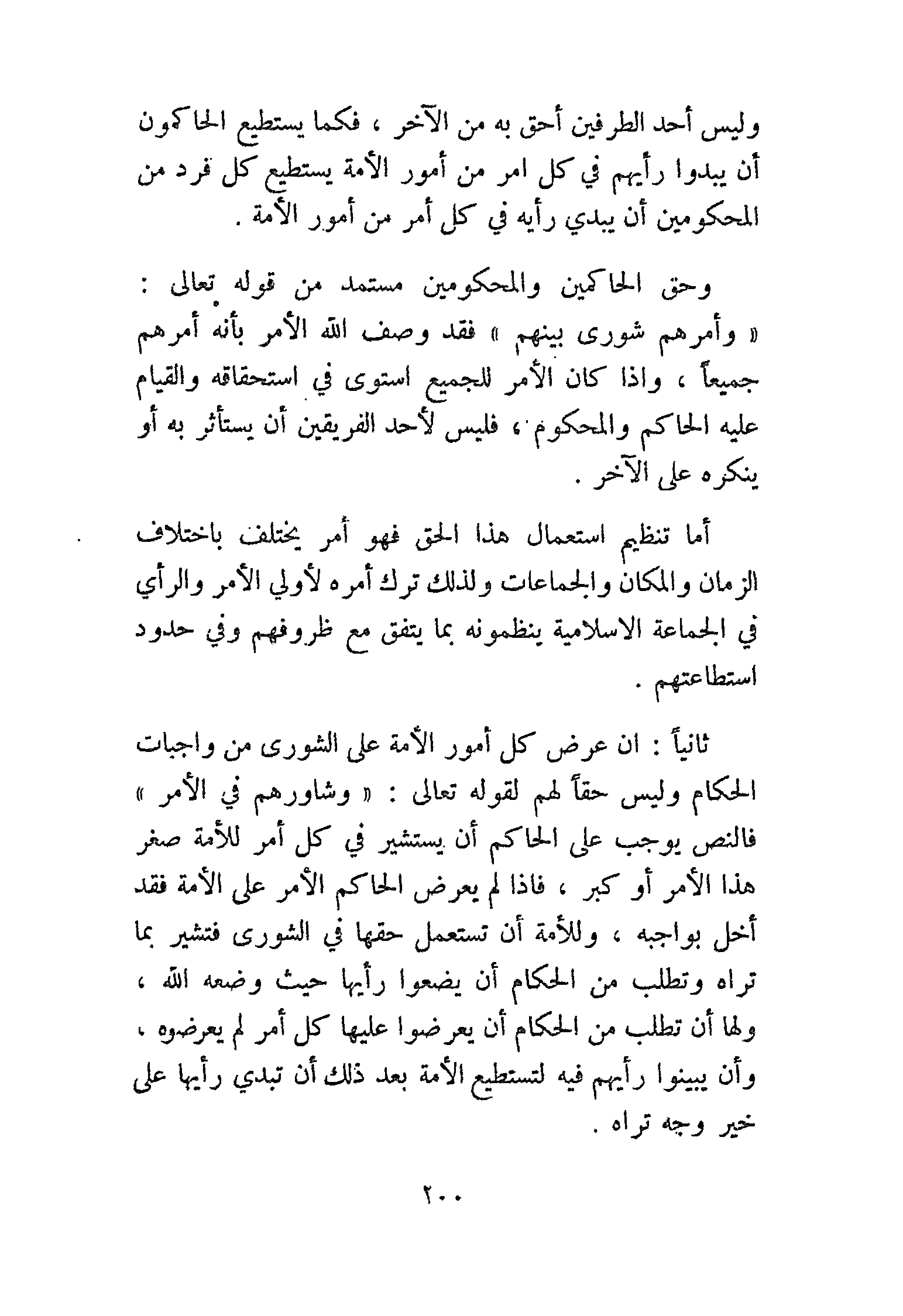 وليس أحد الطرفين أحق به من الآخر، فكما يستطيع الحاكمون أن يبدوا رأيهم في كل أمر من أمور الأمة يستطيع كل فرد من المحكومين أن يبدي رأيه في كل أمر من أمور الأمة.