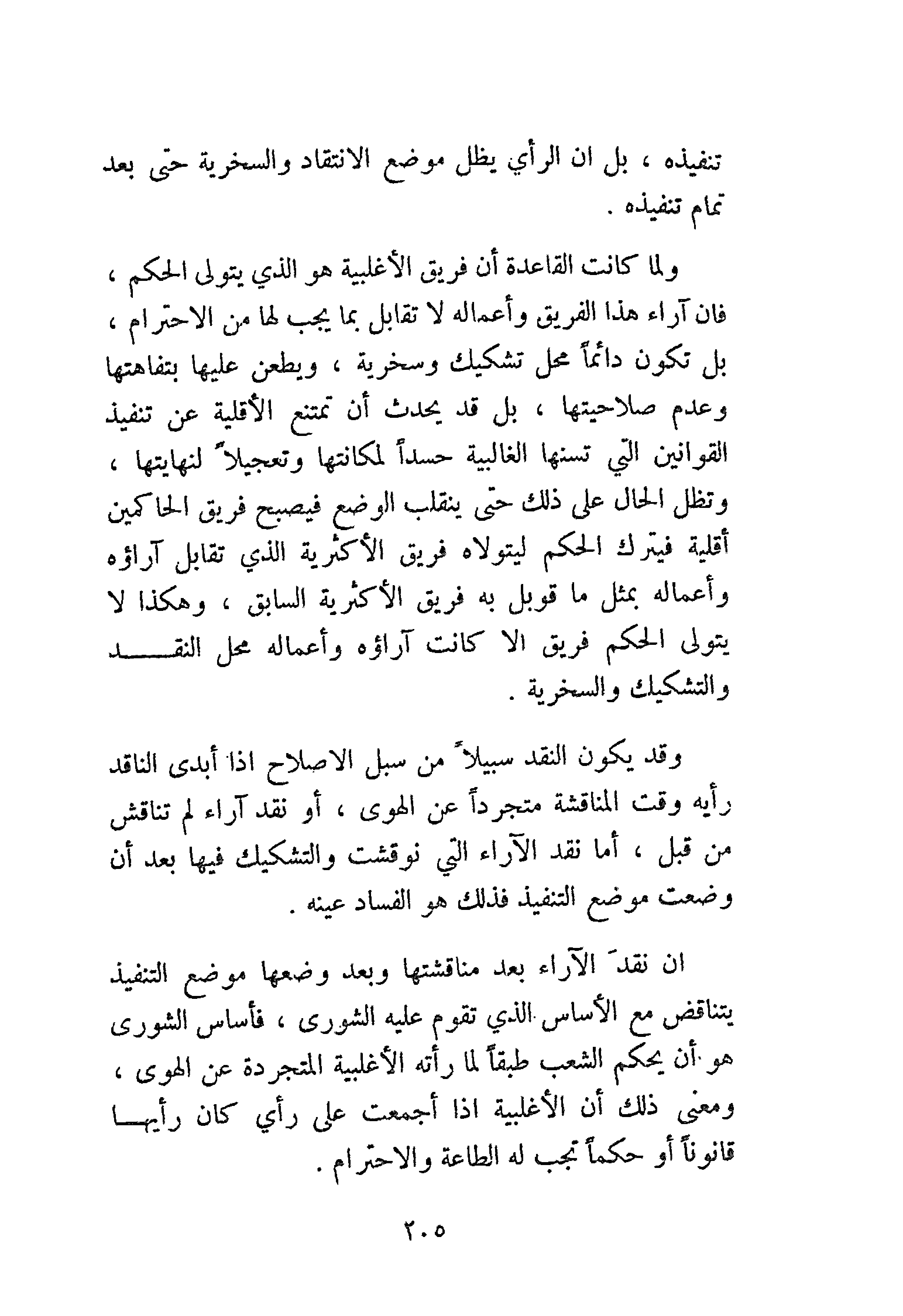 إن نقد الآراء بعد مناقشتها وبعد وضعها موضع التنفيذ يتناقض مع الأساس الذي تقوم عليه الشورى، فأساس الشورى هو أن يحكم الشعب طبقًا لما رأته الأغلبية المتجردة عن الهوى، ومعنى ذلك أن الأغلبية إذا اجتمعت على رأي كان رأيها قانونًا أو حكمًا تجب له الطاعة والاحترام.