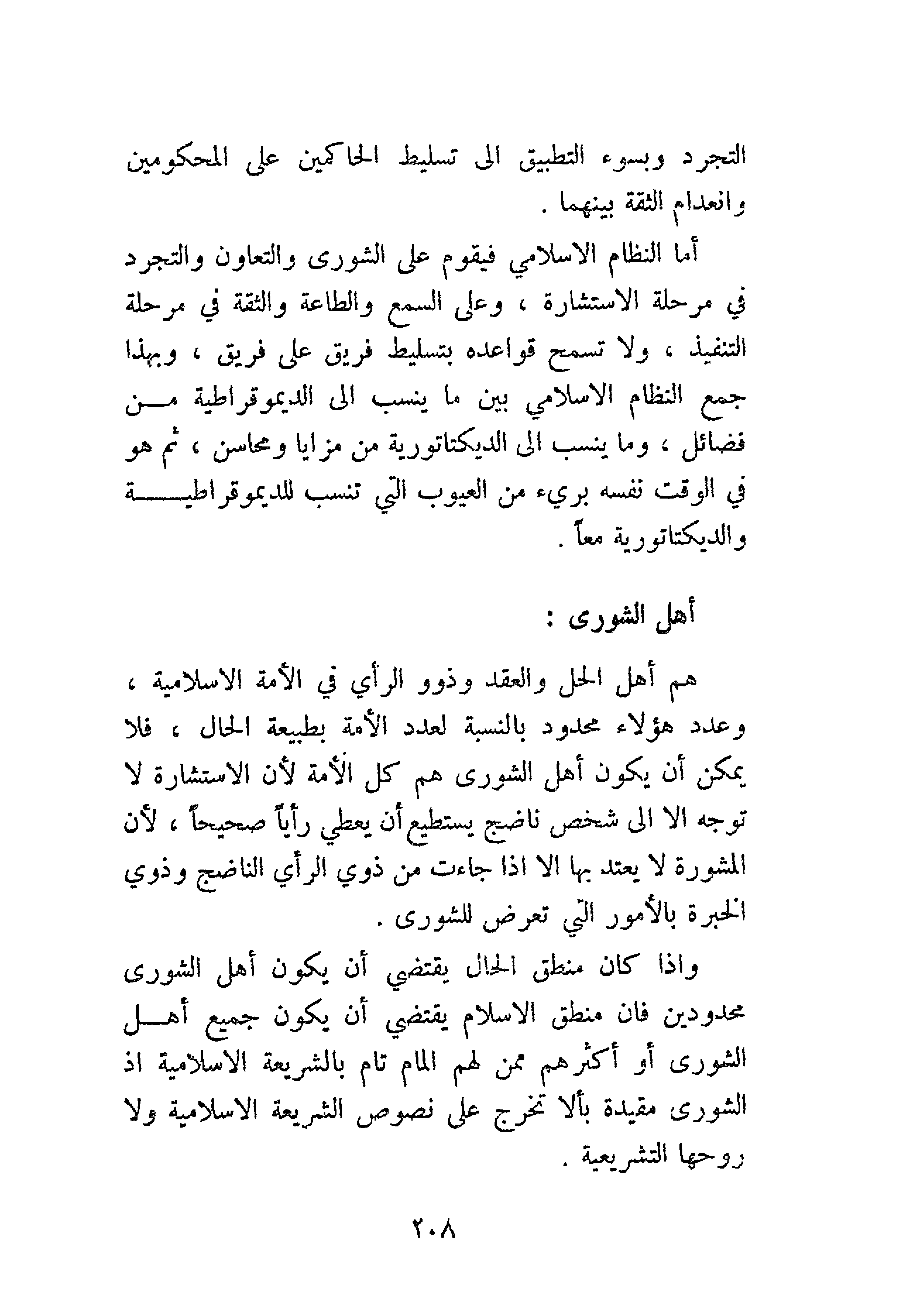 أما النظام الإسلامي فيقوم على الشورى والتعاون والتجرد في مرحلة الاستشارة، وعلى السمع والطاعة والثقة في مرحلة التنفيذ، ولا تسمح قواعده بتسليط فريق على فريق، وبهذا جمع النظام الإسلامي بين ما ينسب إلى الديموقراطية من فضائل، وما ينسب إلى الديكتاتورية من مزايا ومحاسن، ثم هو في الوقت نفسه بريء من العيوب التي تنسب للديموقراطية والديكتاتورية مَعًا.